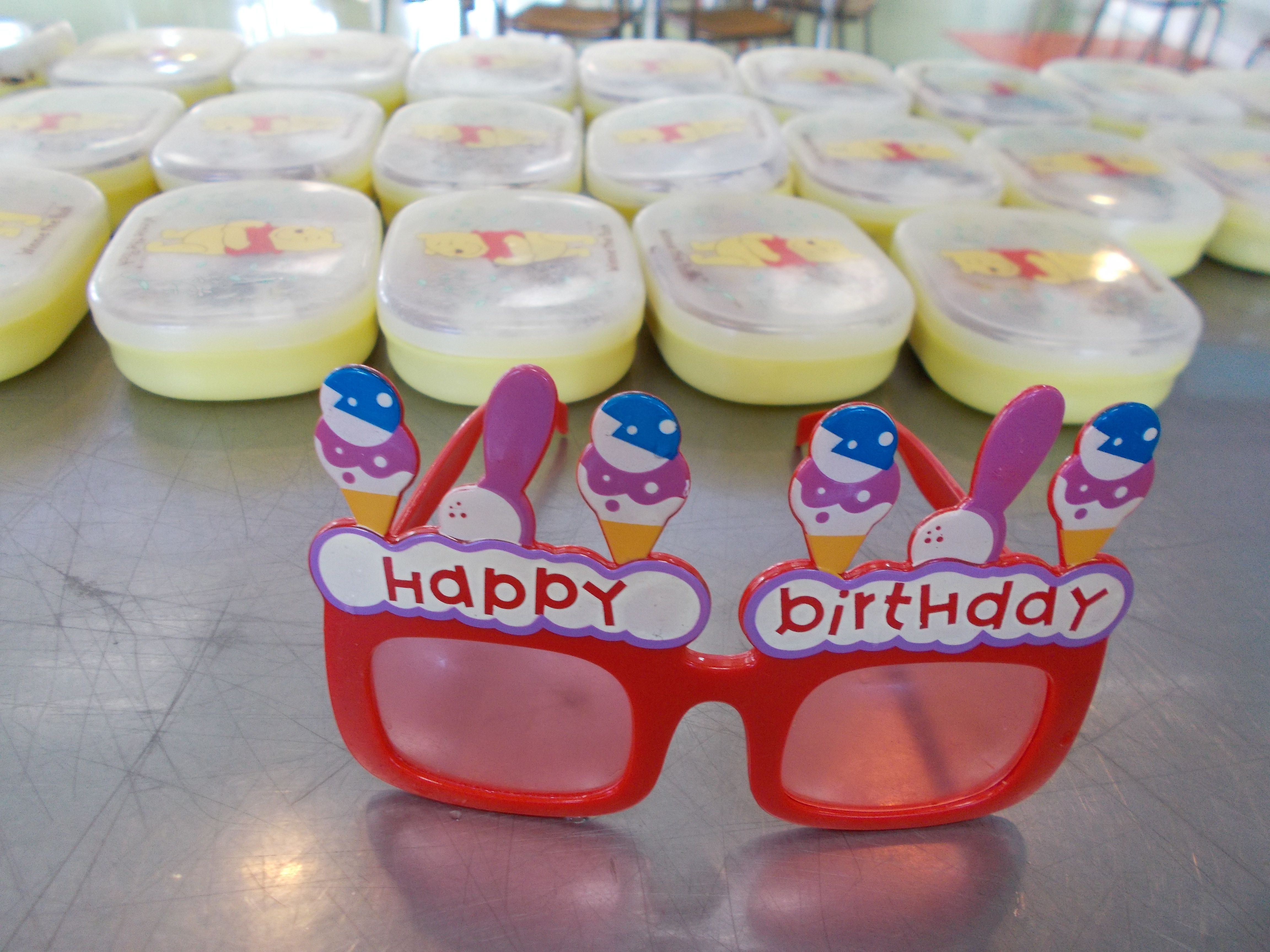 ふりかけご飯・かき玉スープ・から揚げ・付け合わせ きゅうり、トマト・カップケーキ