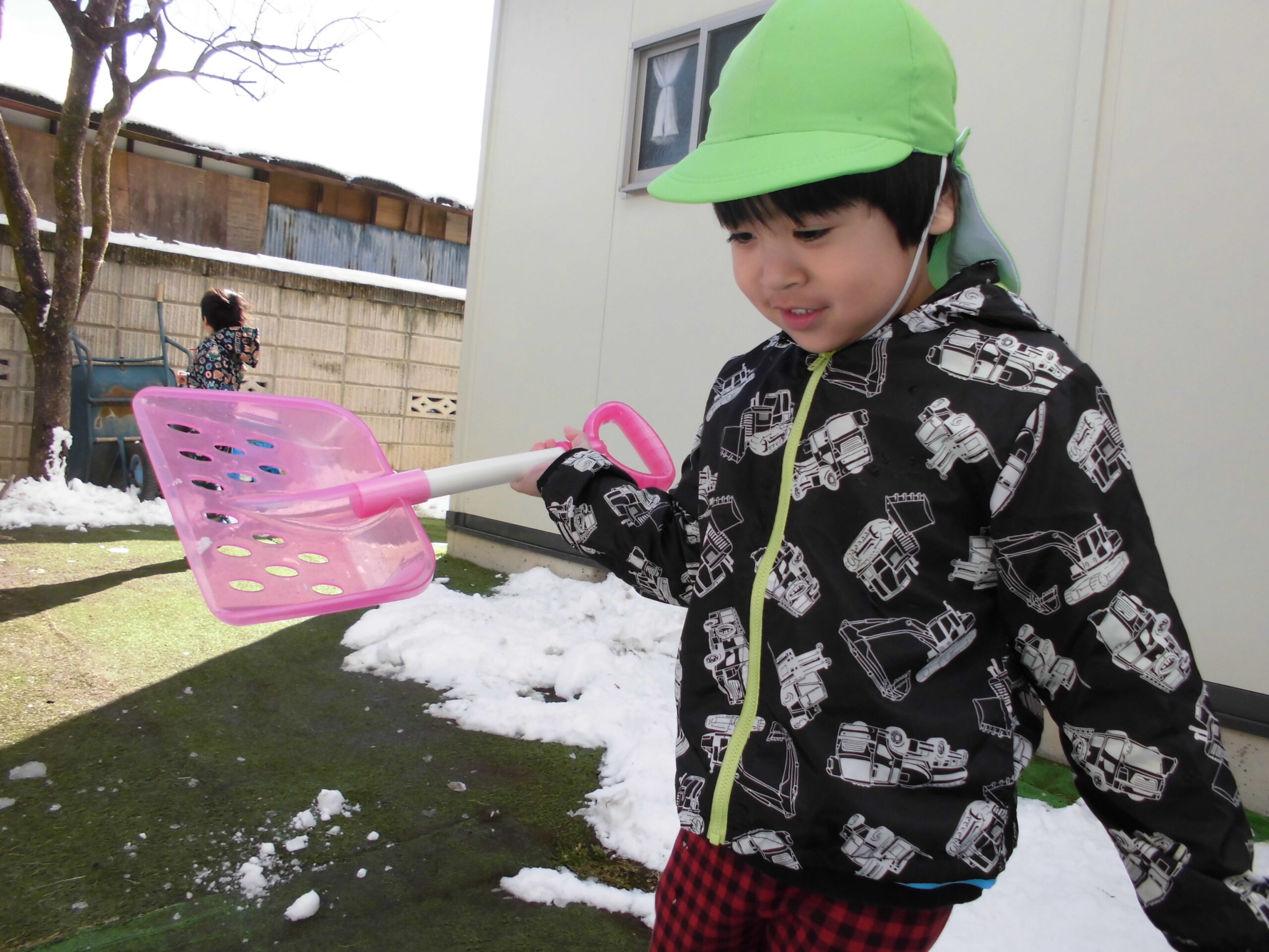 2月9日雪が積もりましたね。かわいいシャベルにはるちゃん大喜び!