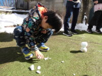鈴木先生がもってきてくれた雪玉マシーンでたくさん作って並べました。