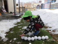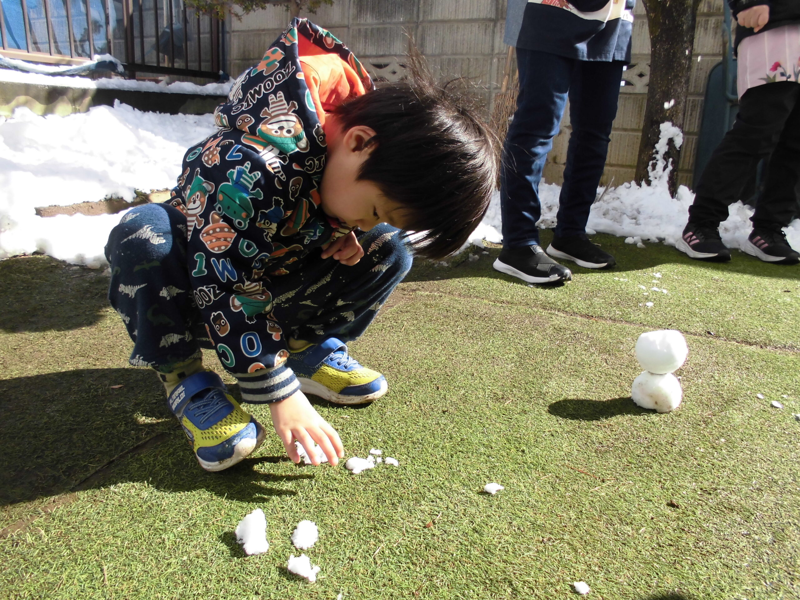 れおくんも恐る恐る雪を触って、楽しみました。冷たいっ 雪玉をふたつつなげると雪ダルマだね。