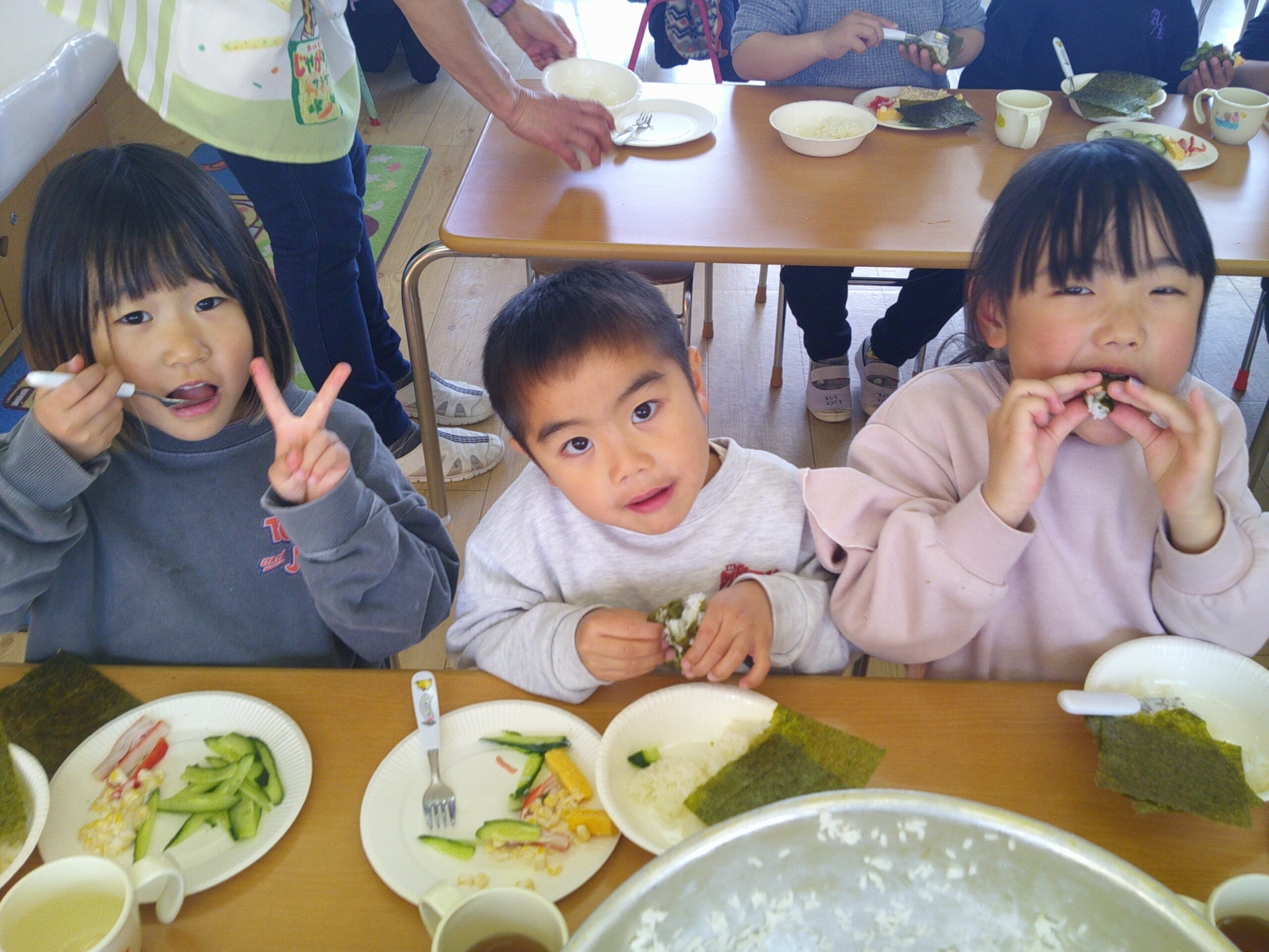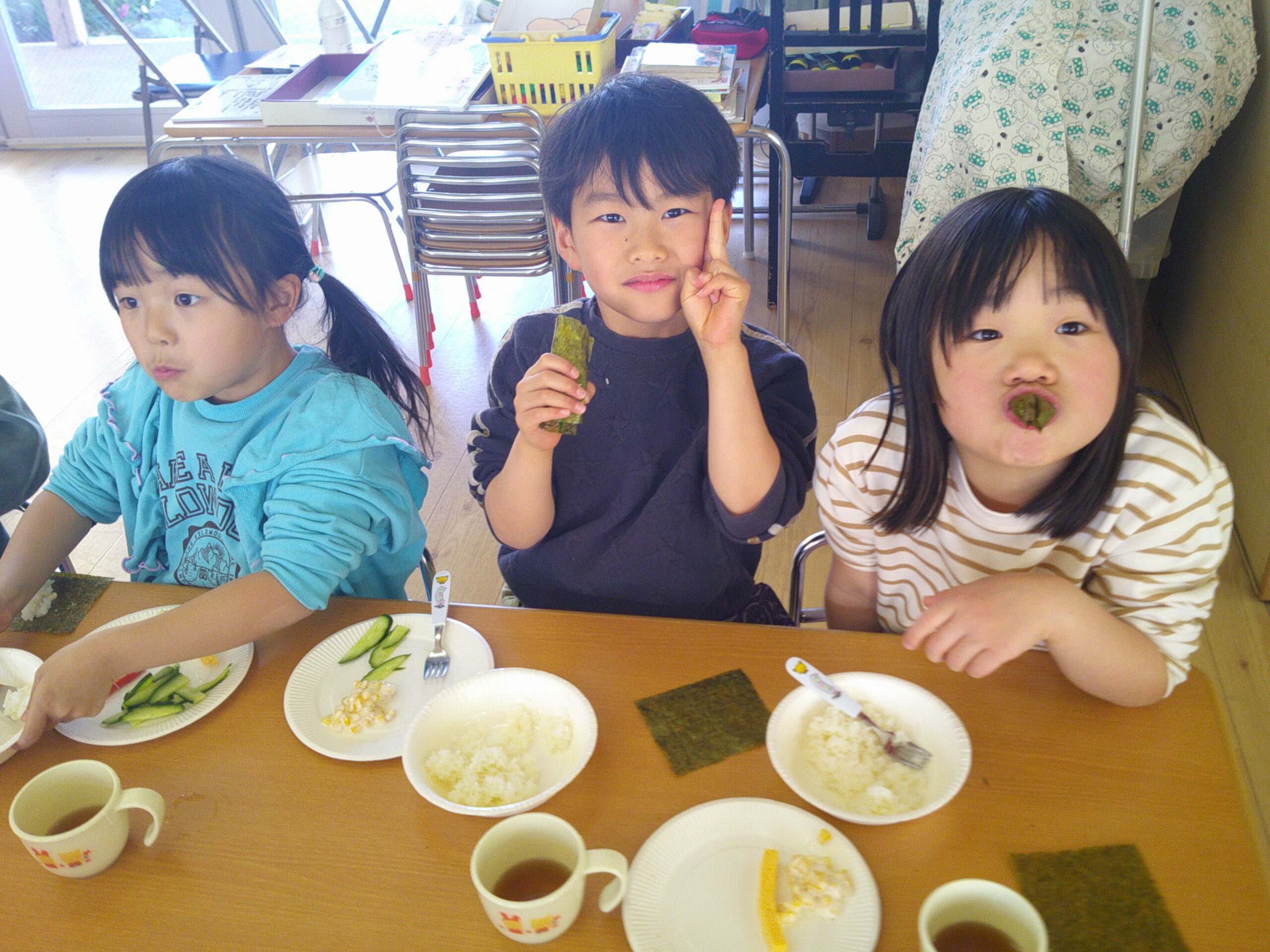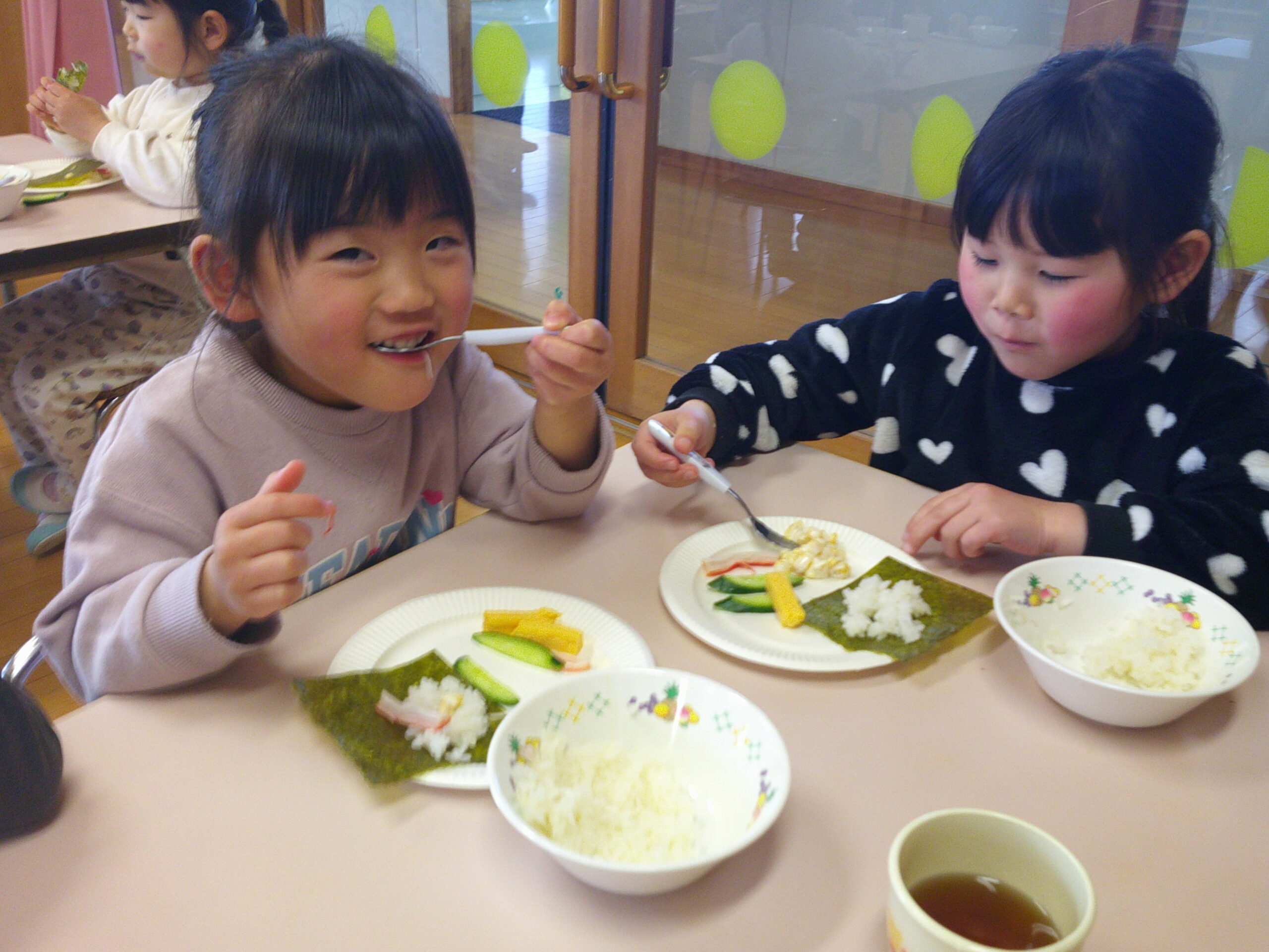 昨日に続き、ホールに給食を食べに来てくれたにじ・おひさま組の子達。