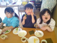 にじ・おひさま組の子たちはお口のまわりをきなこだらけにして