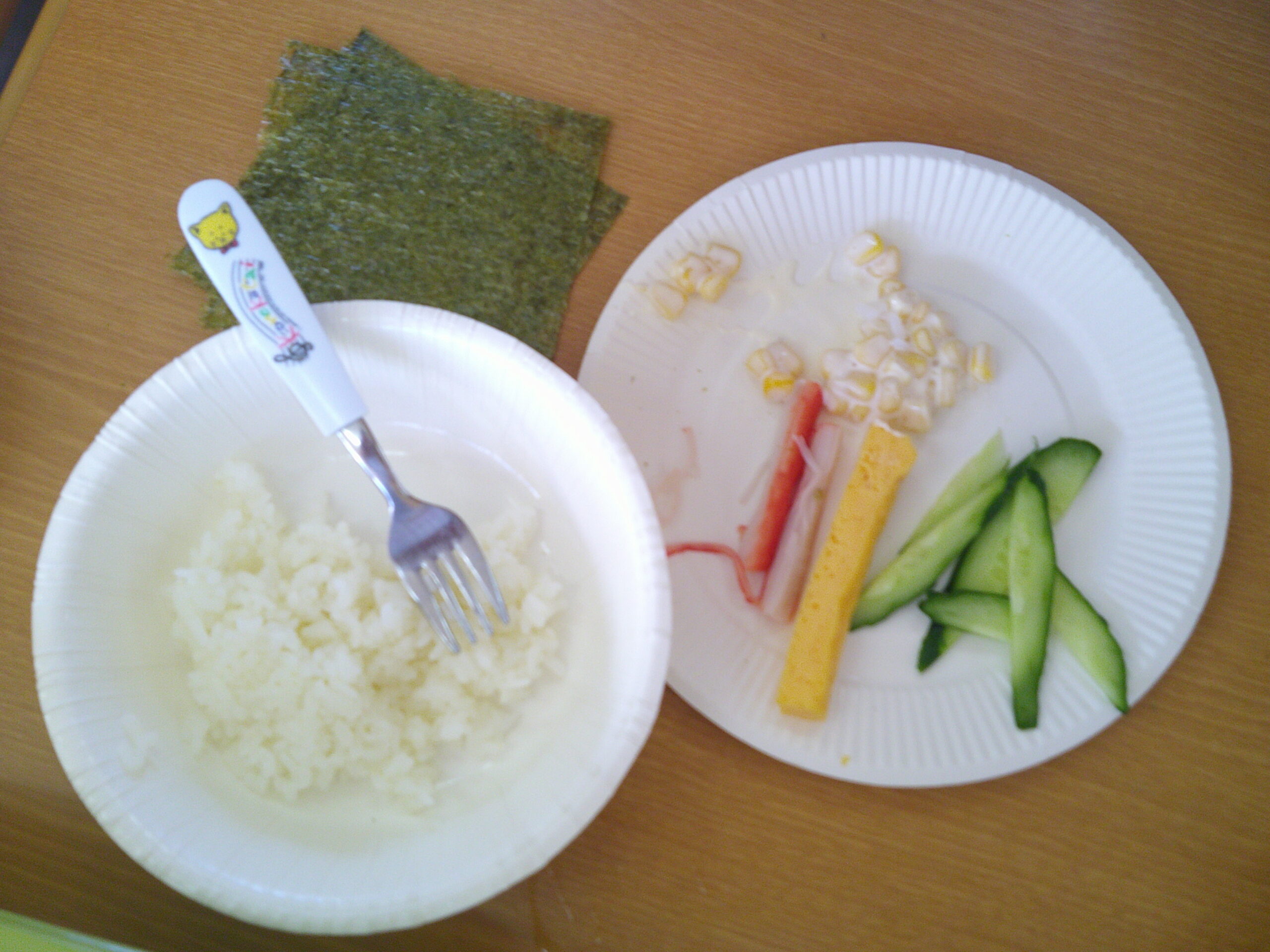 少しづつ少しづつ給食のおかずを食べてくれるようになってきました。