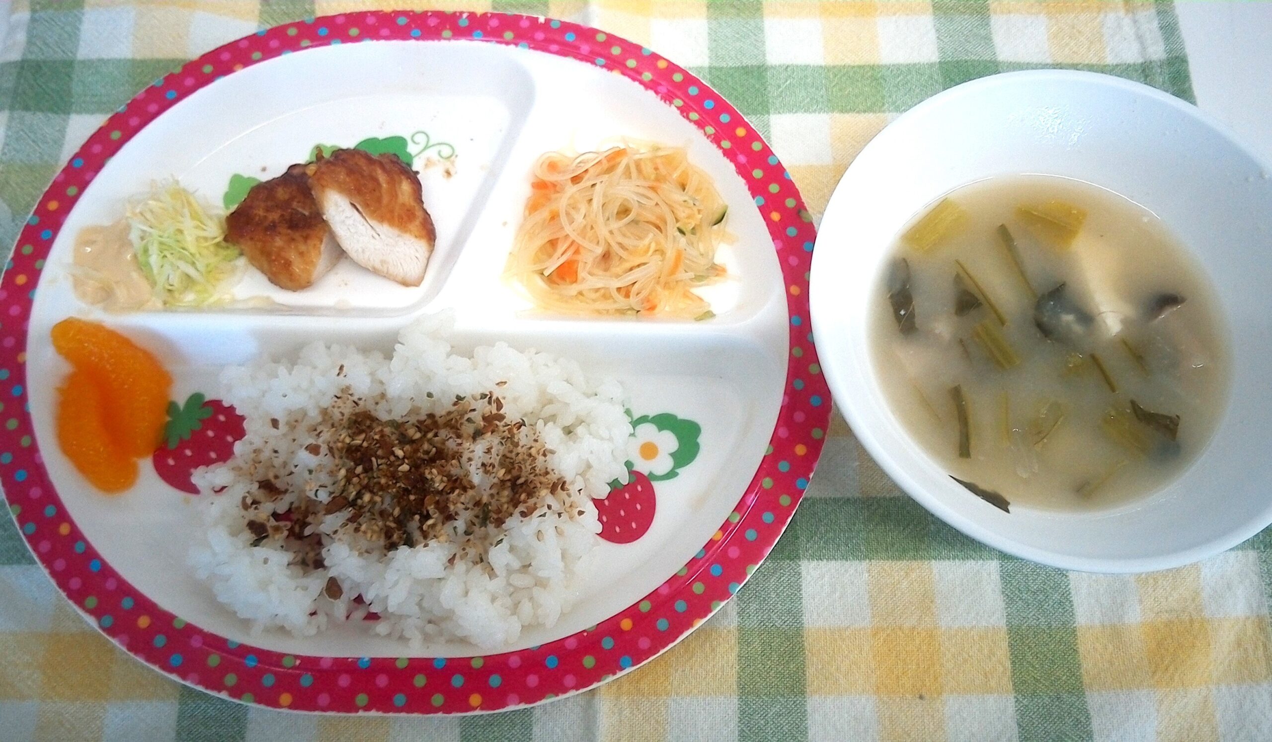 ふりかけご飯・くずし豆腐の味噌汁・唐揚げ・春雨サラダ・