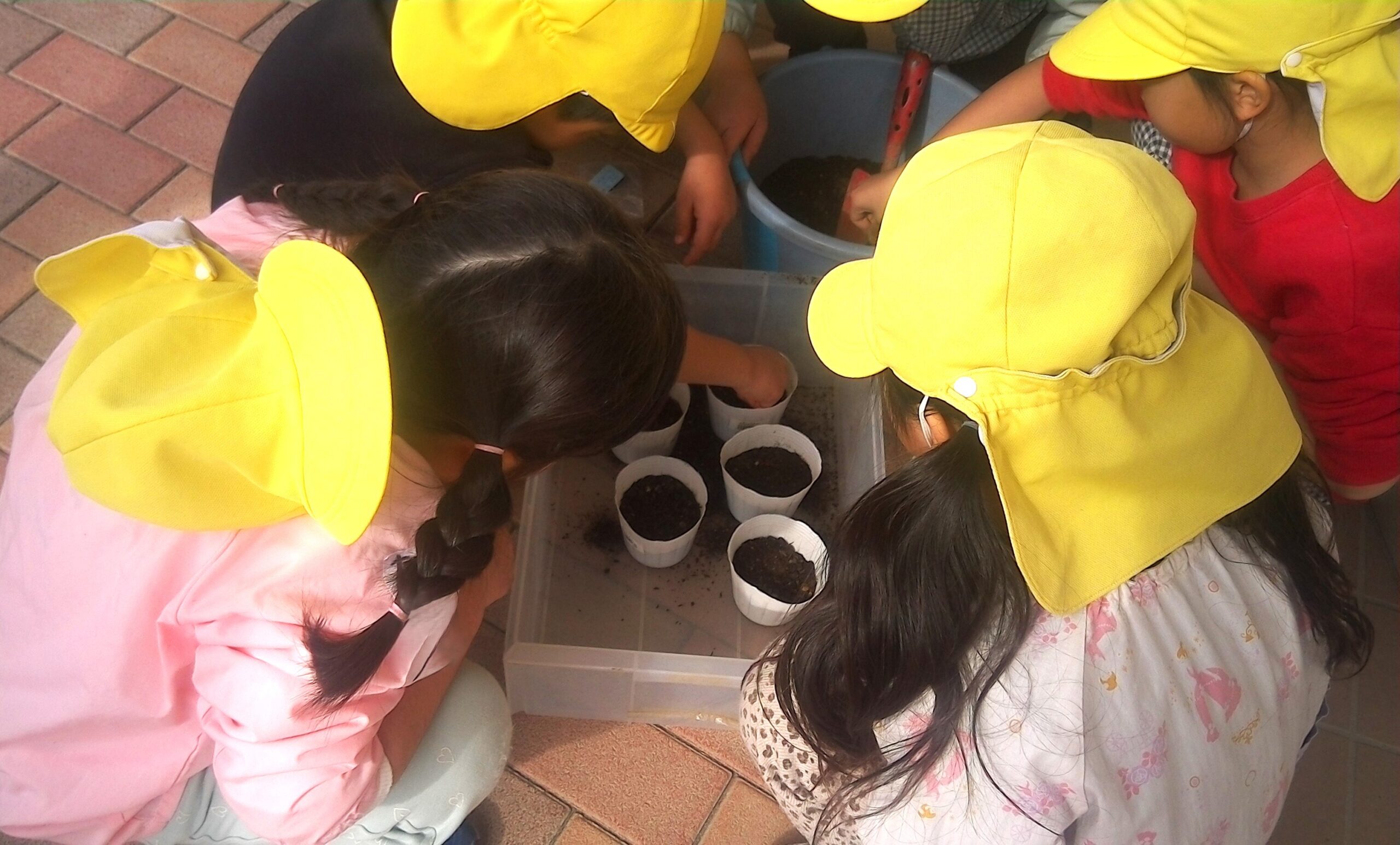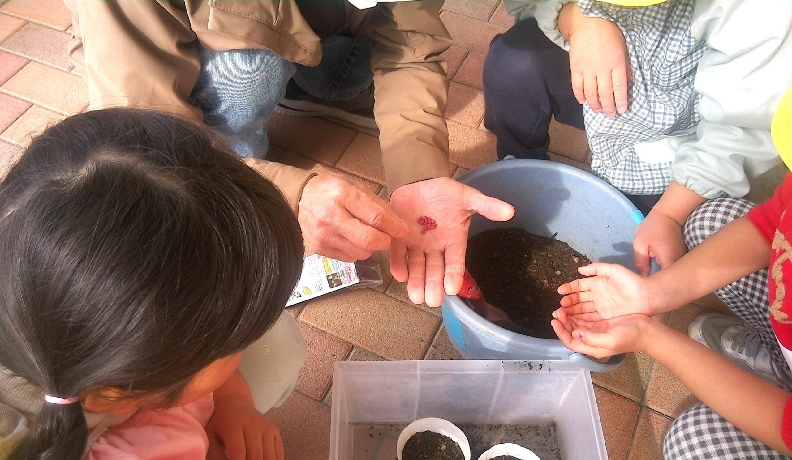 土の入れ方、種のまき方、お水のやり方を教えてもらって。