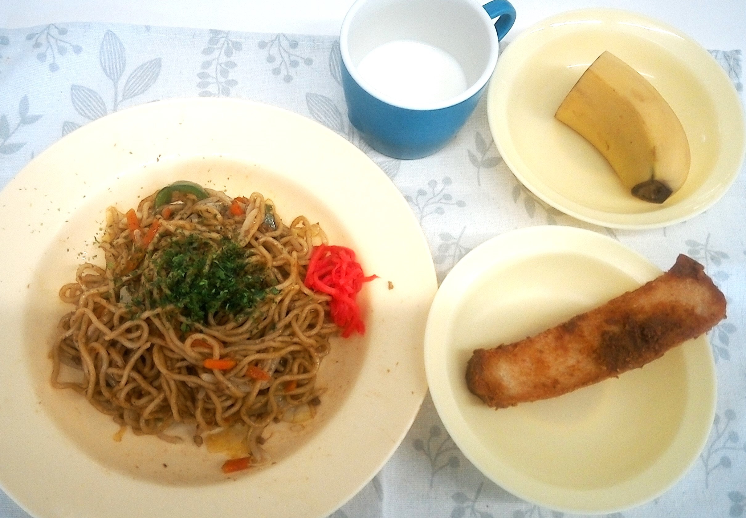 焼きそば・きなこパン・バナナ・牛乳