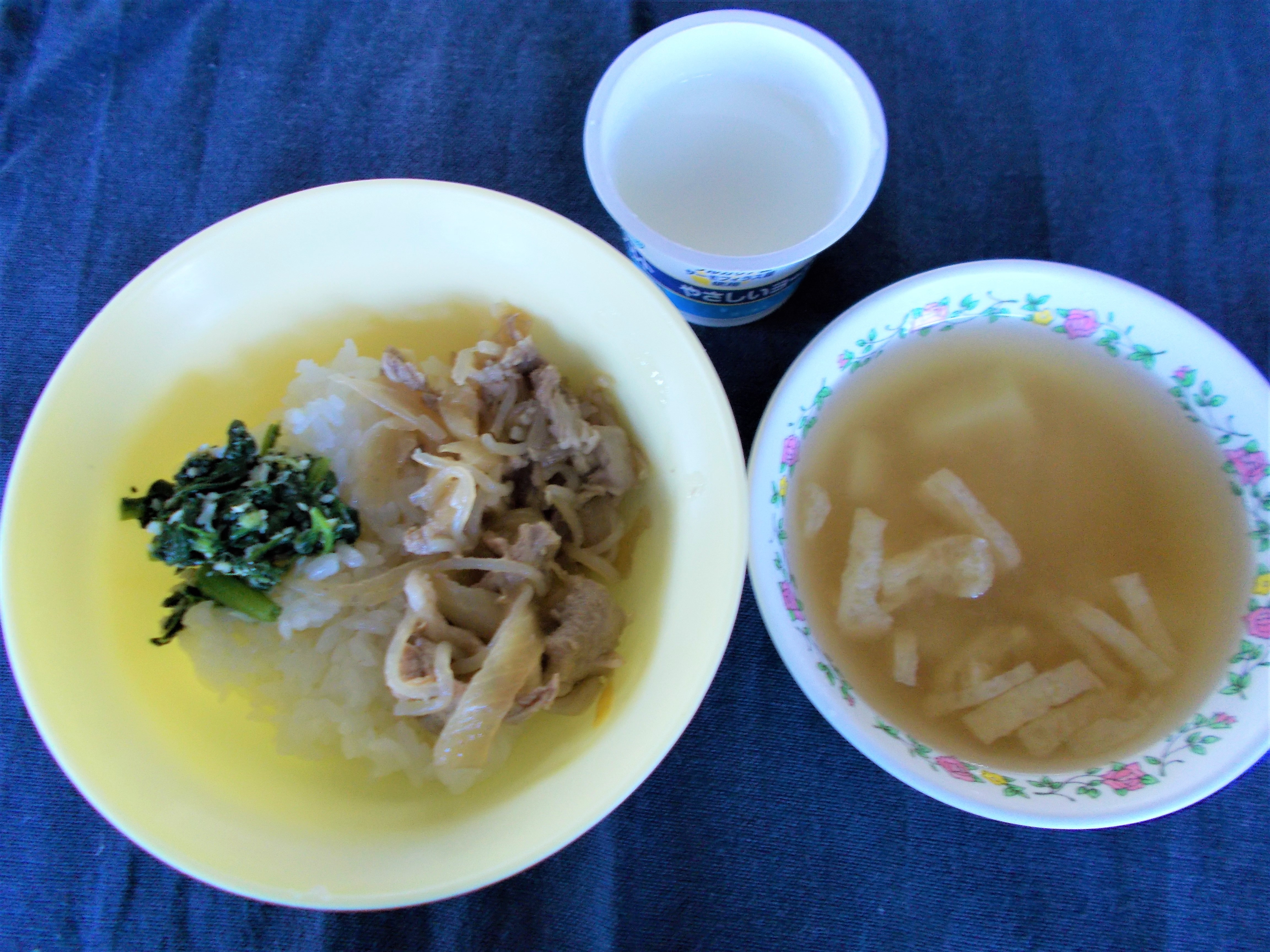 筍ごはん・小松菜スープ・厚揚げのそぼろ煮・切り干し大根のサラダ・ミニトマト・きゅうり浅漬け