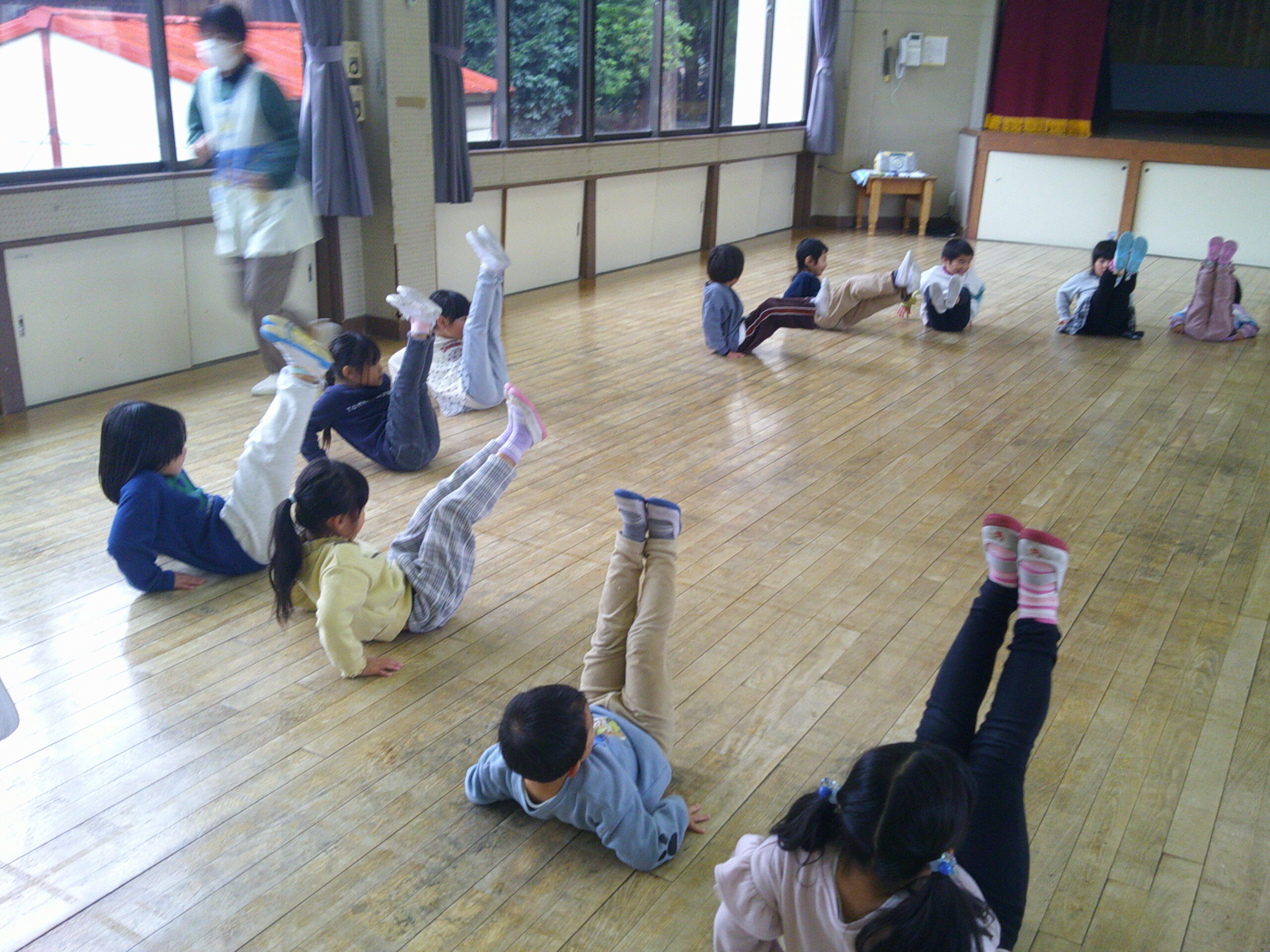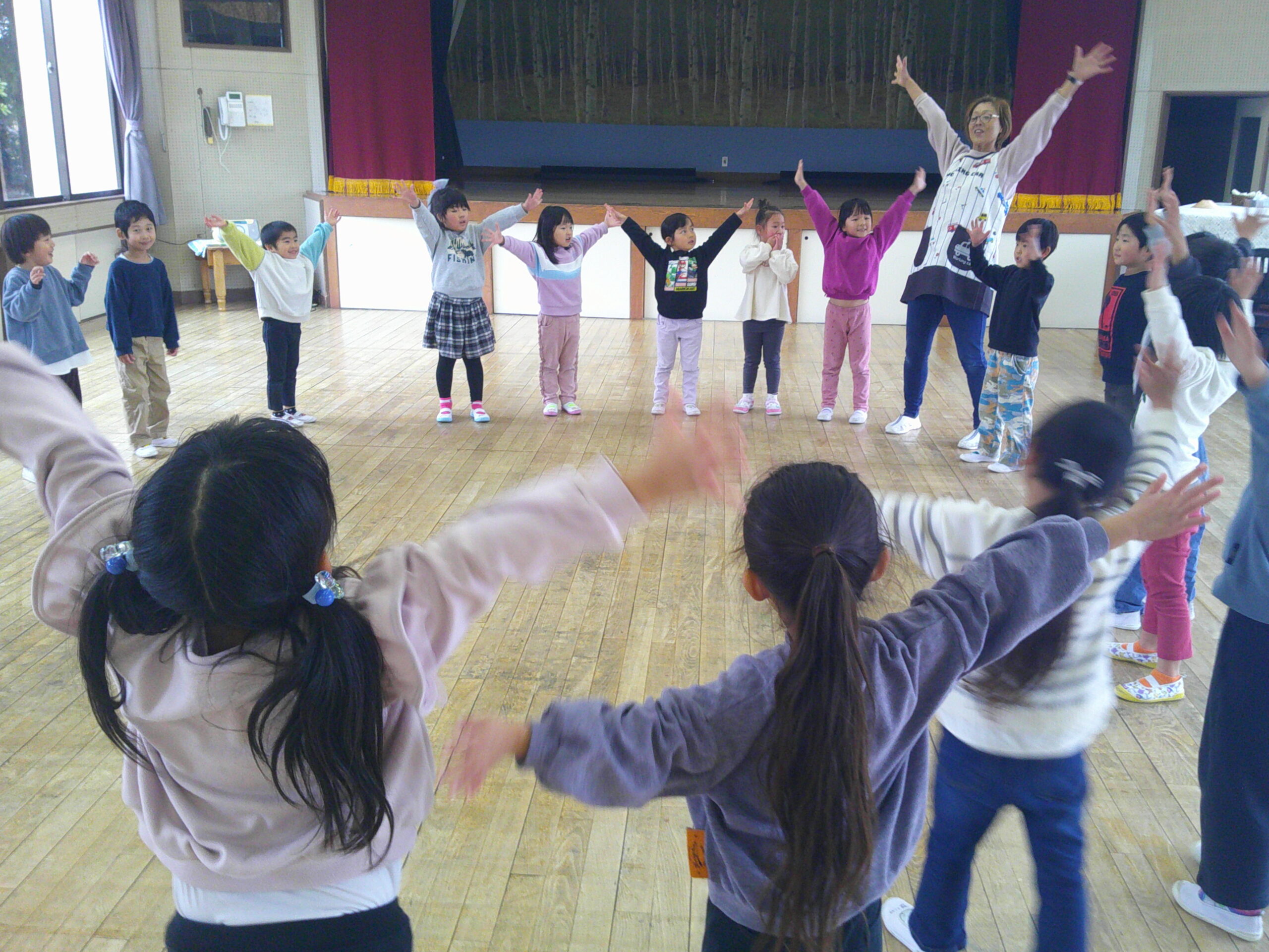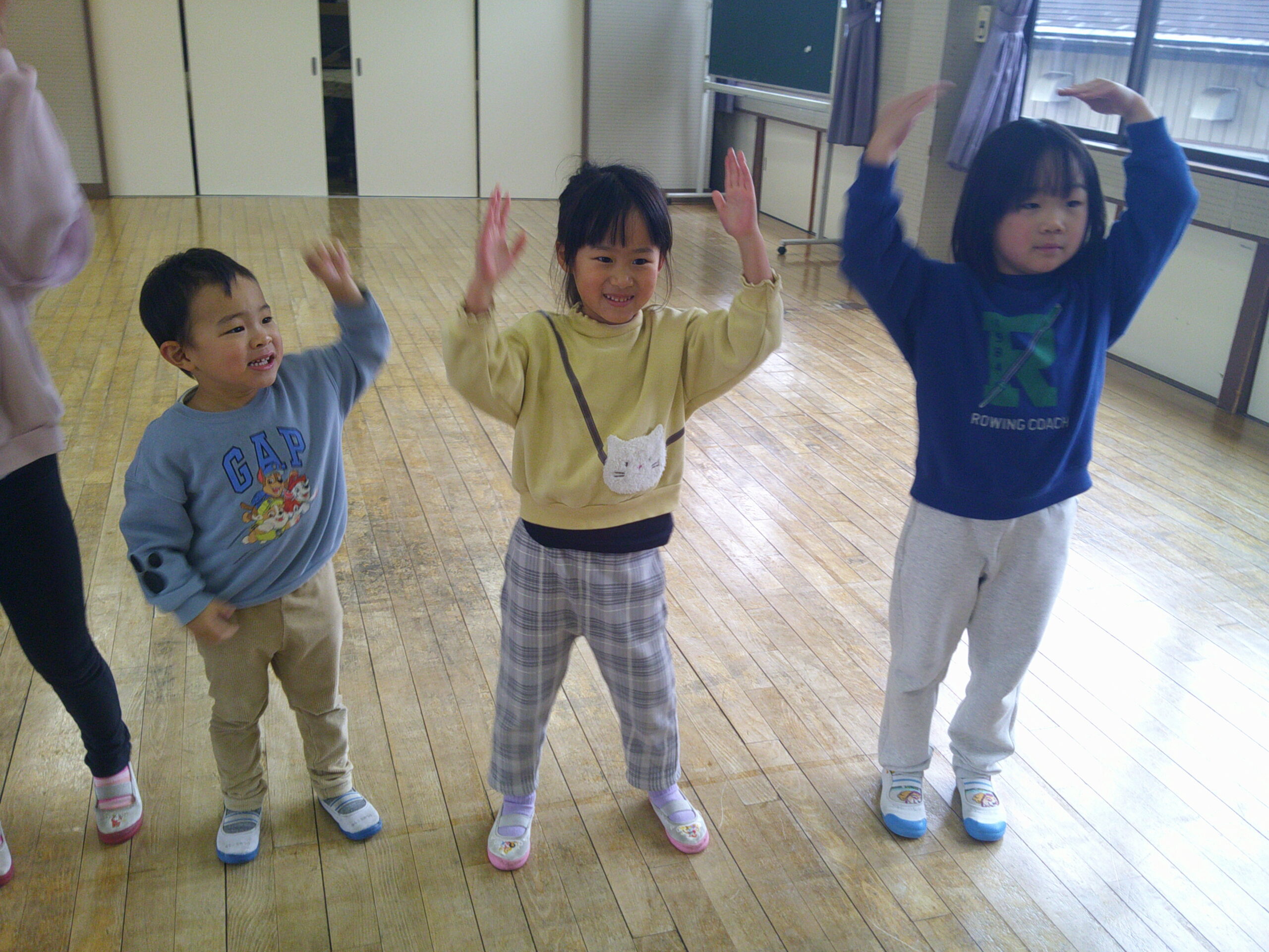 雨天のため お遊戯室でダンスや鬼ごっこで遊びました。