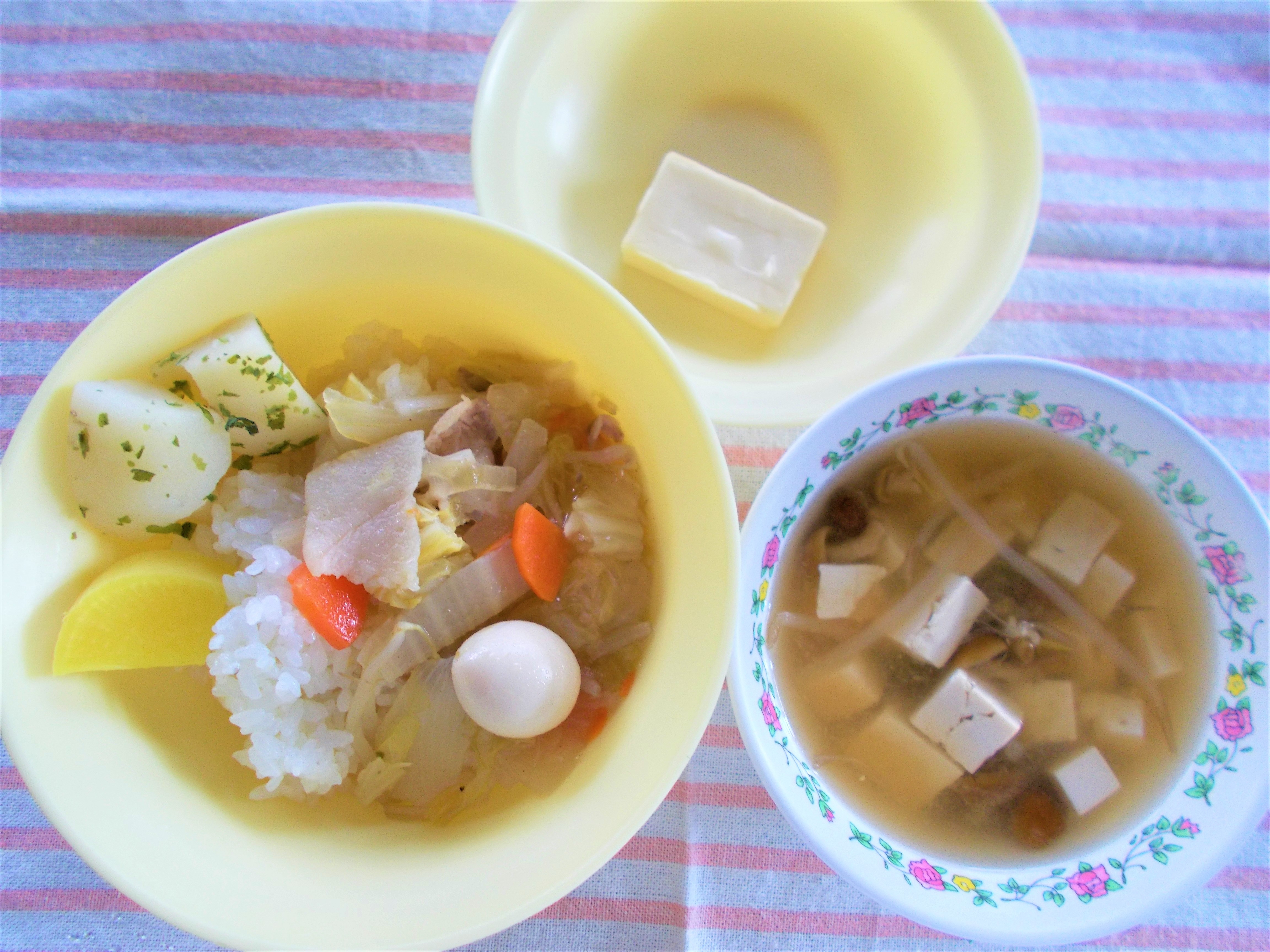 しらすわかめご飯・小松菜と木綿豆腐のスープ・ロールキャベツ・ごぼうサラダ・みかん缶・