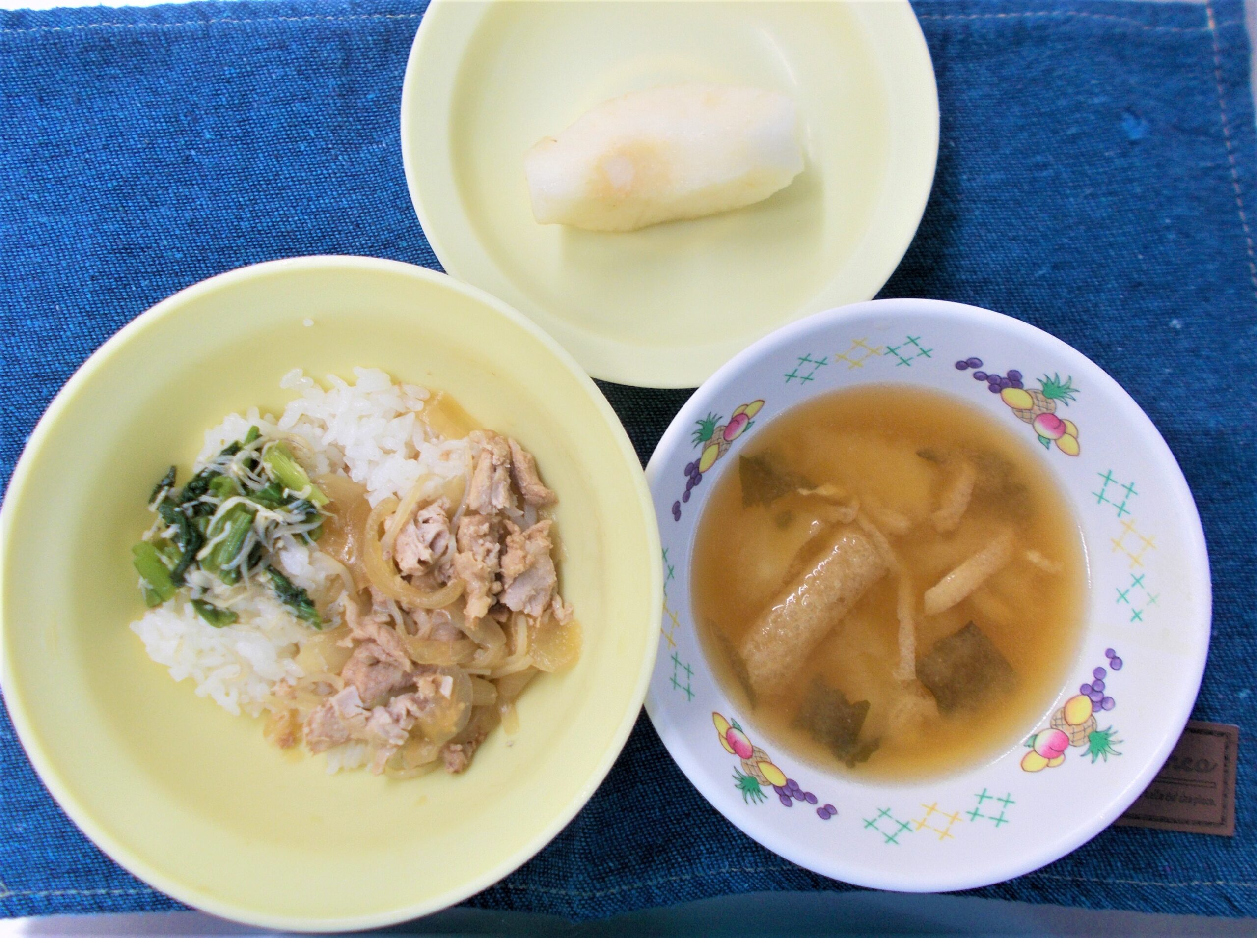豚丼・じゃが芋の味噌汁・小松菜しらす和え・梨