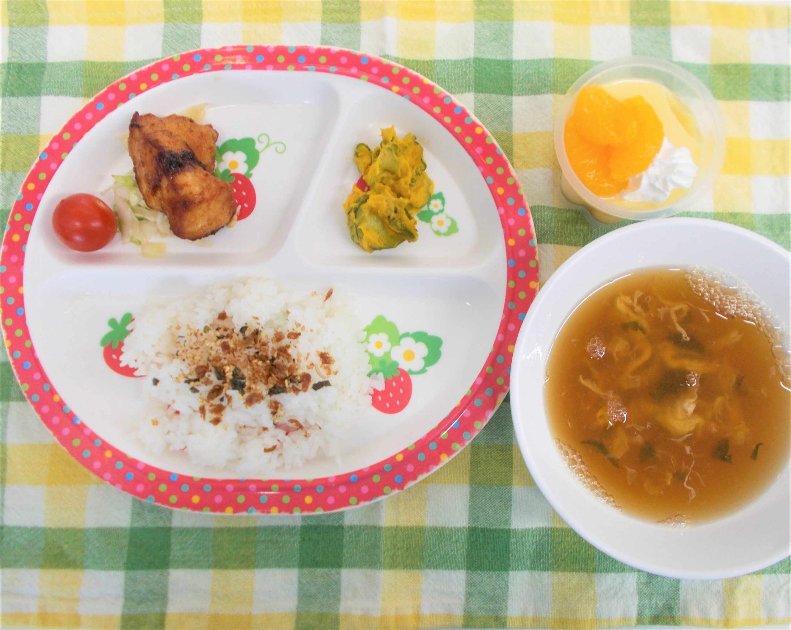 ふりかけご飯・かきたまスープ・から揚げ・カボチャサラダ・プリンアラモード