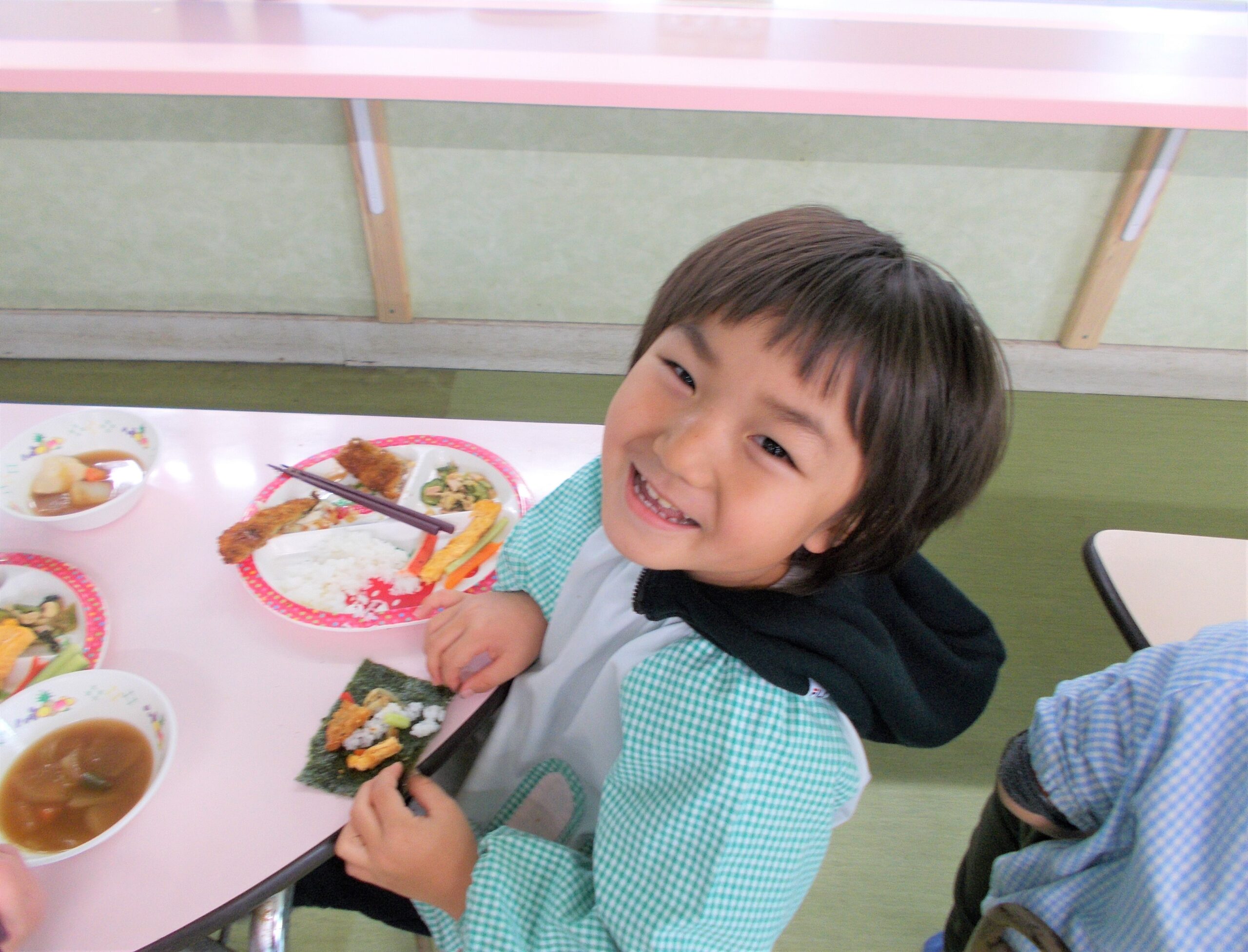 みんな、思い思いに海苔に具をのせて上手に巻いて楽しそうに食べていましたよ~。