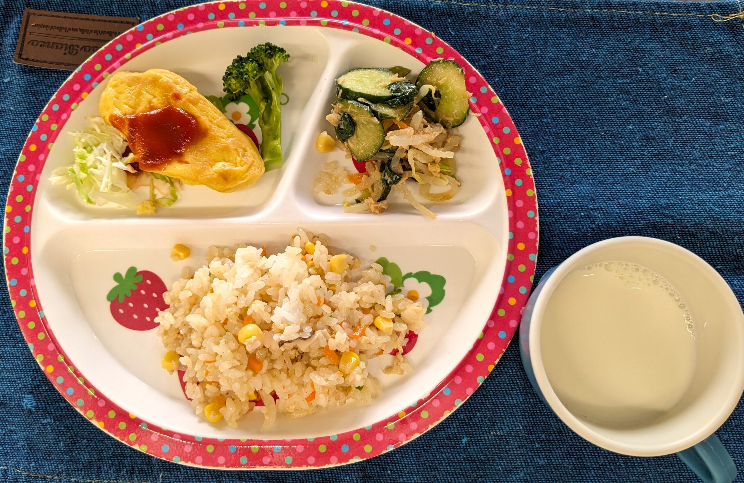 チャーハン・オムレツ・ツナサラダ・牛乳・ゆでブロッコリー(園で収穫したもの)
