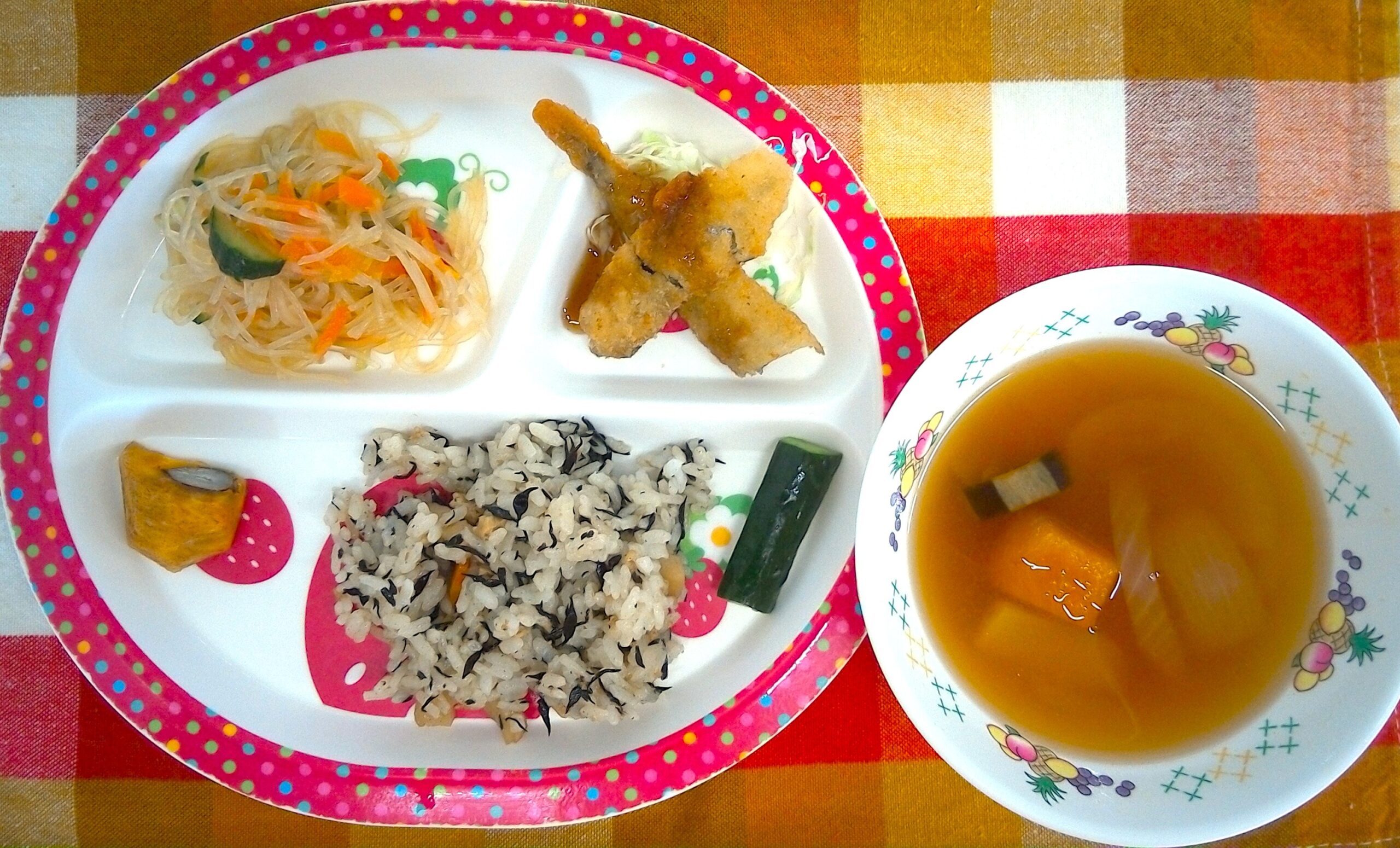 ひじきご飯・かぼちゃの味噌汁(なす入り)・ししゃもフライ・