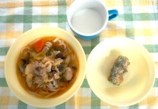 そして、今日の給食はあったか肉うどん。