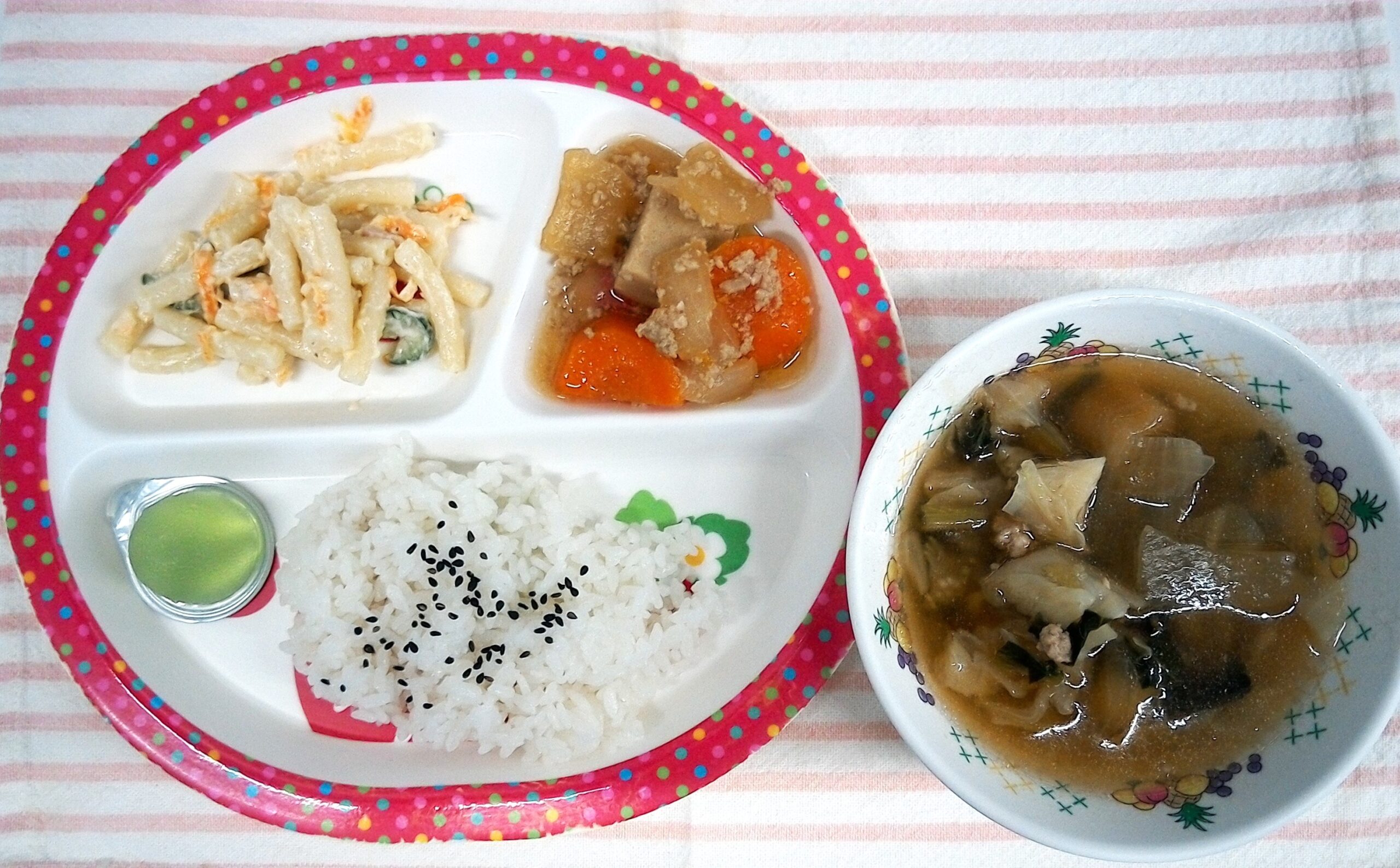 今日の給食は、ミートボールと切り干し大根のサラダ。