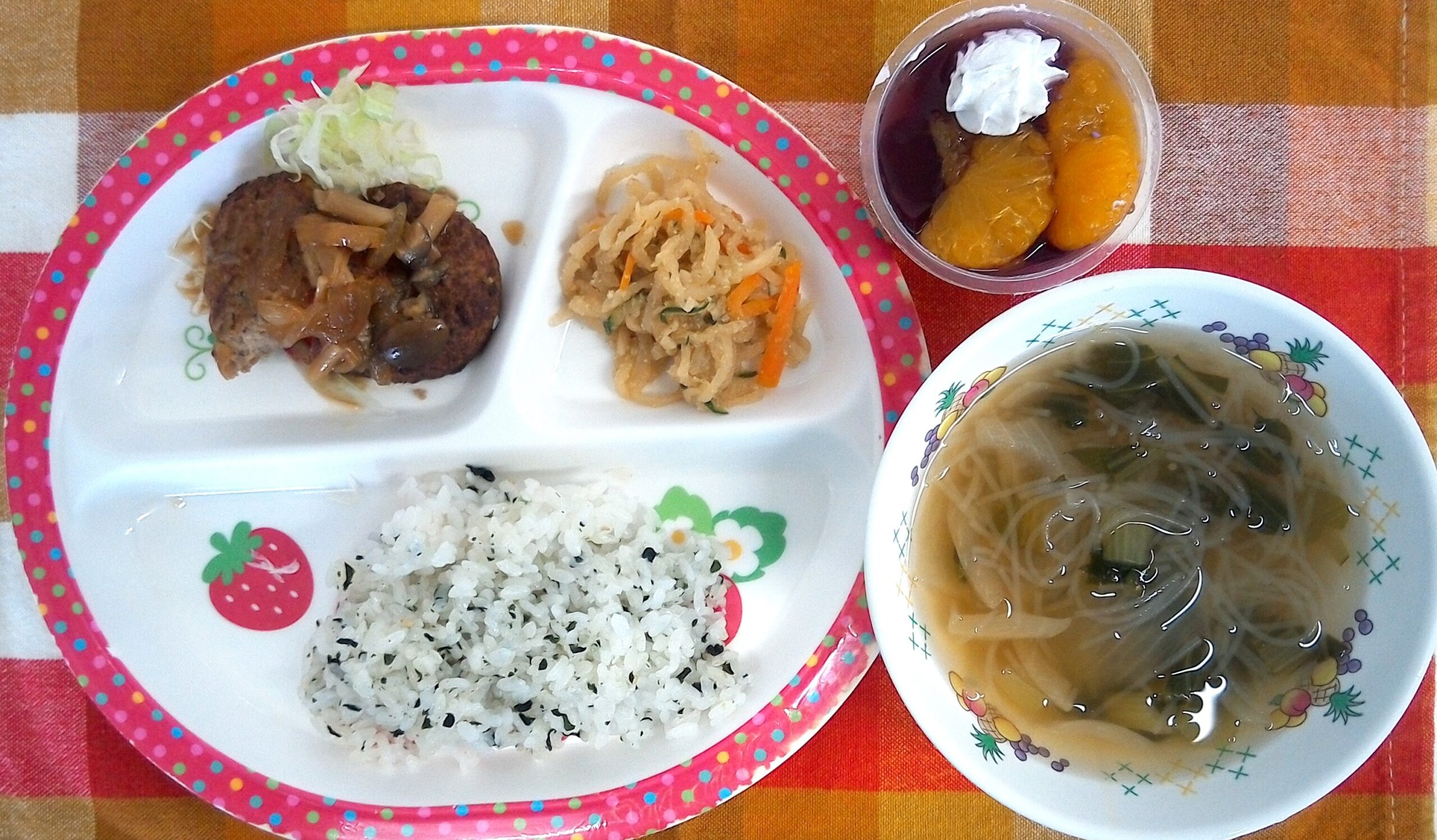 わかめご飯・春雨スープ・ハンバーグBBQソース・切干大根のサラダ・