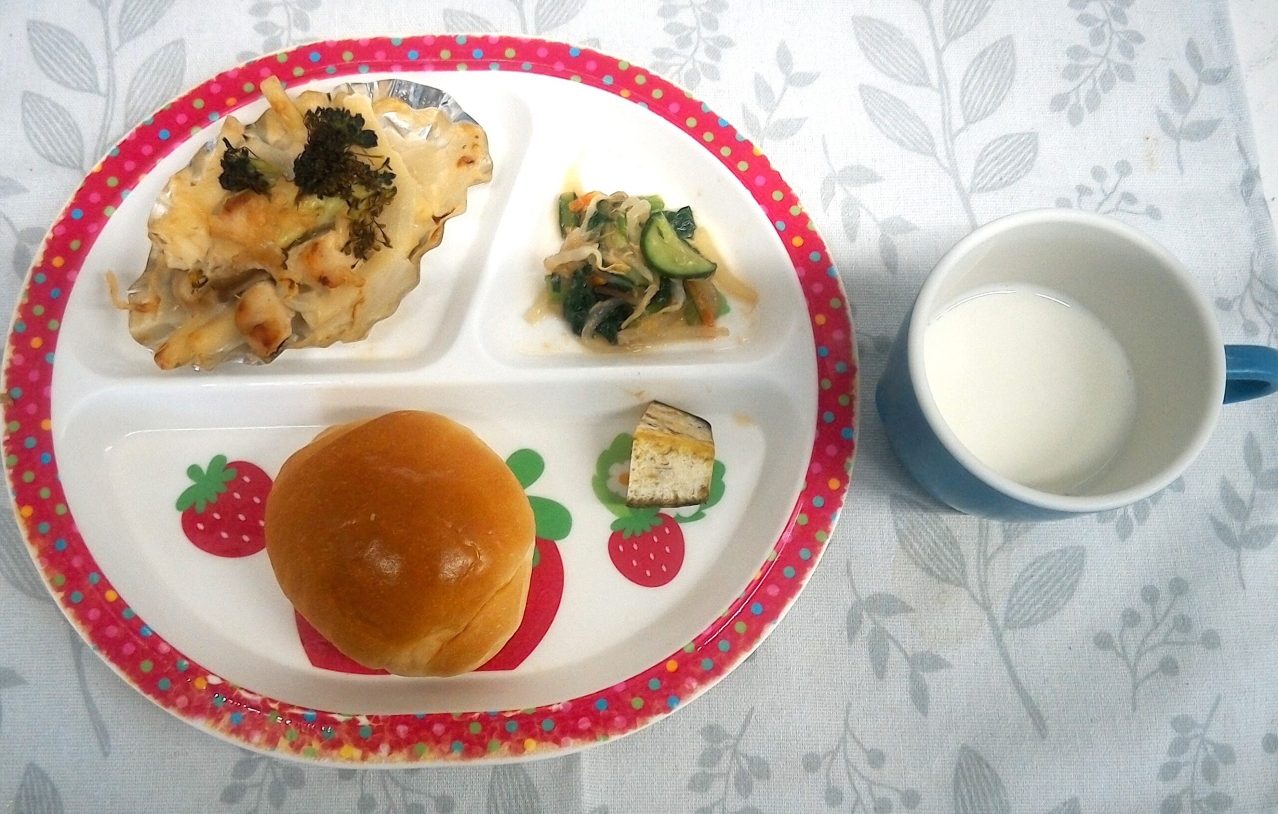 今日の給食の主菜は「白身魚のパン粉焼き」