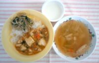 まーぼー丼・じゃが芋キャベツ人参油揚げの具沢山汁・青菜しらすあえ・