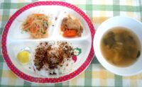 今日の給食は、しらすわかめご飯に春雨スープ。