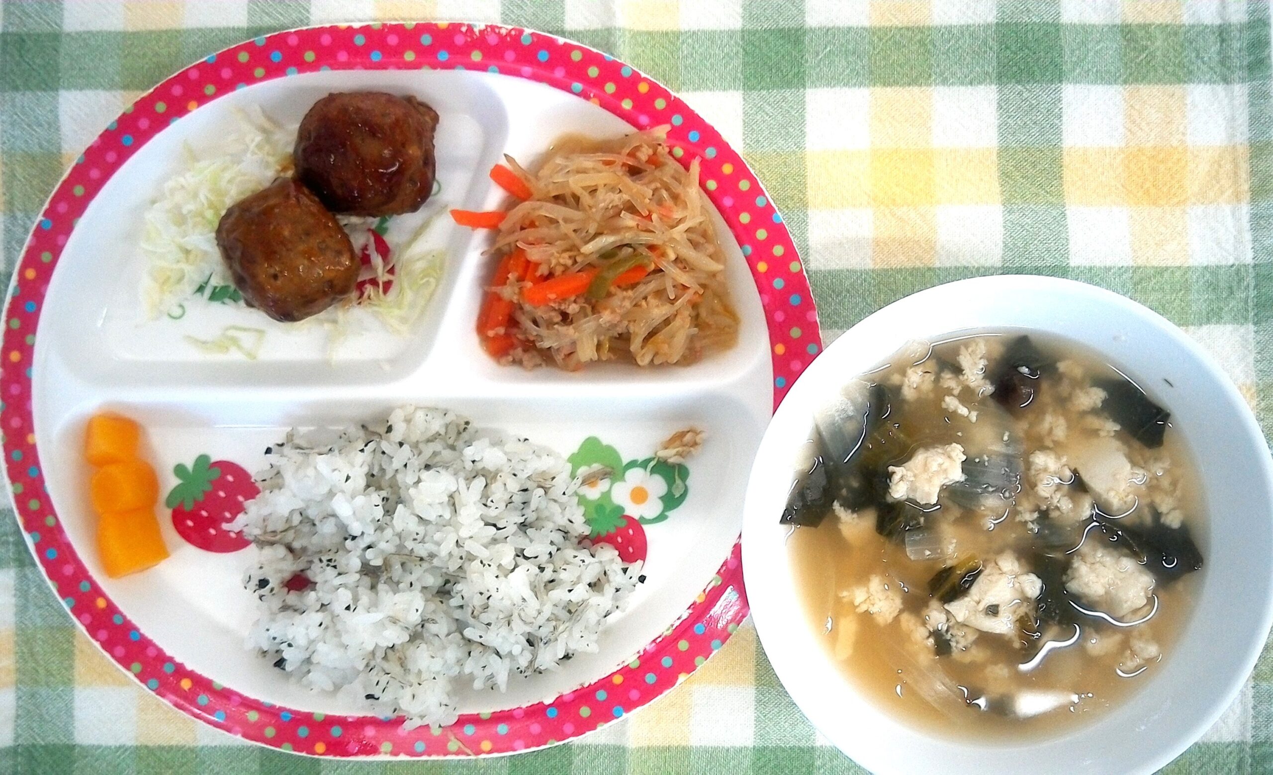 しらすわかめご飯・くずし豆腐のスープ・ミートボール・チャプチェ・
