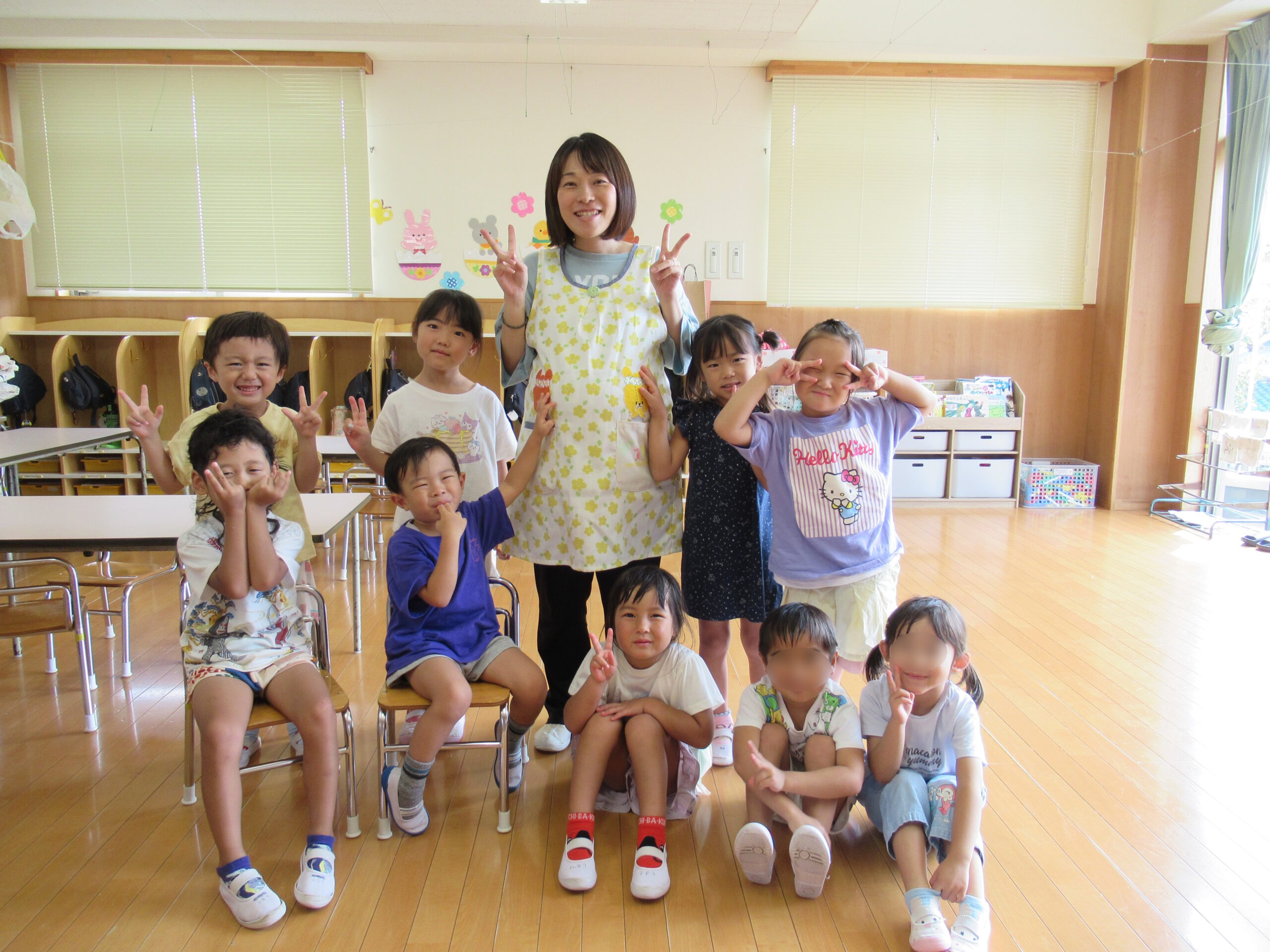 たくさんの子どもたちと幸せなこども園の時間を作ってきてくれた青木先生がお母さんになります。2学期から産休・育休に入りますが、今日はうさぎ組のぱんだの子どもたちと一緒のところを写真に撮らせてもらいました。