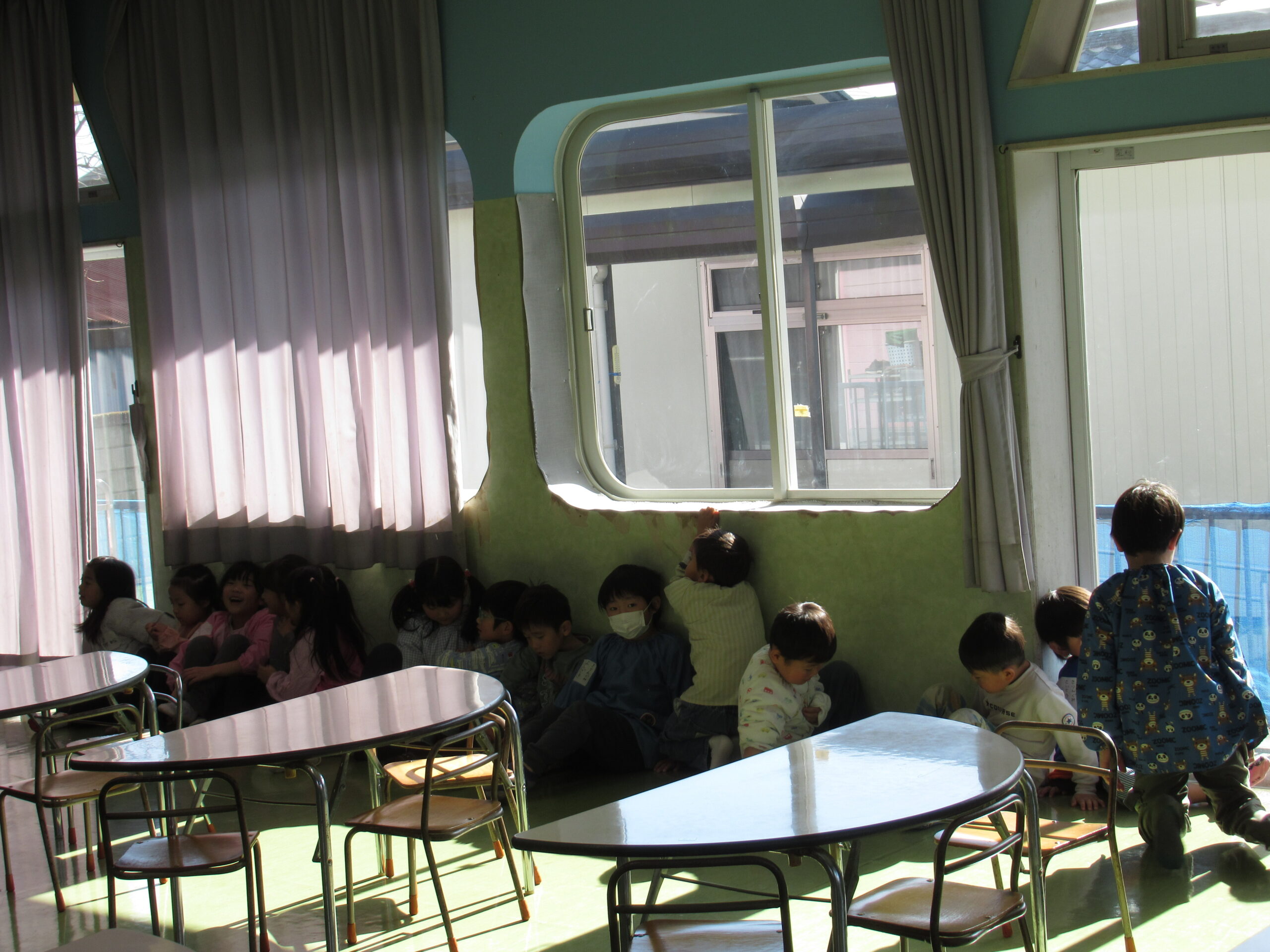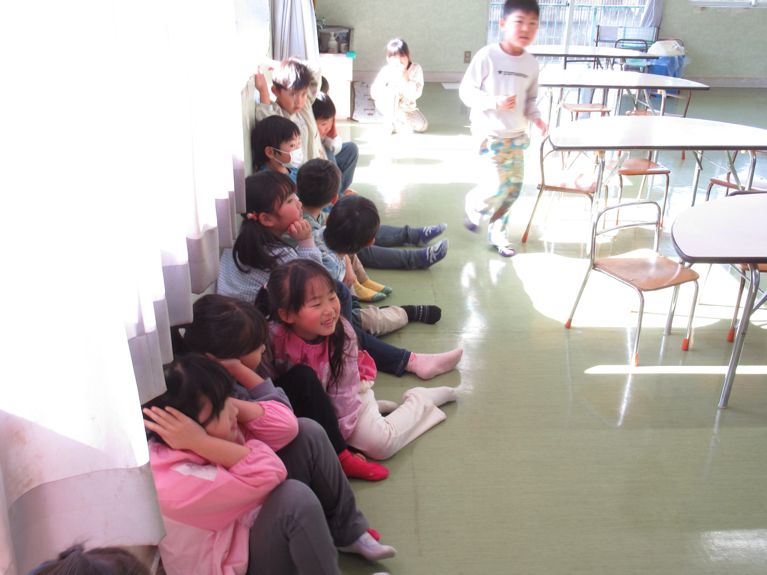 神妙な顔で2階で待機する4歳児うさぎ組。