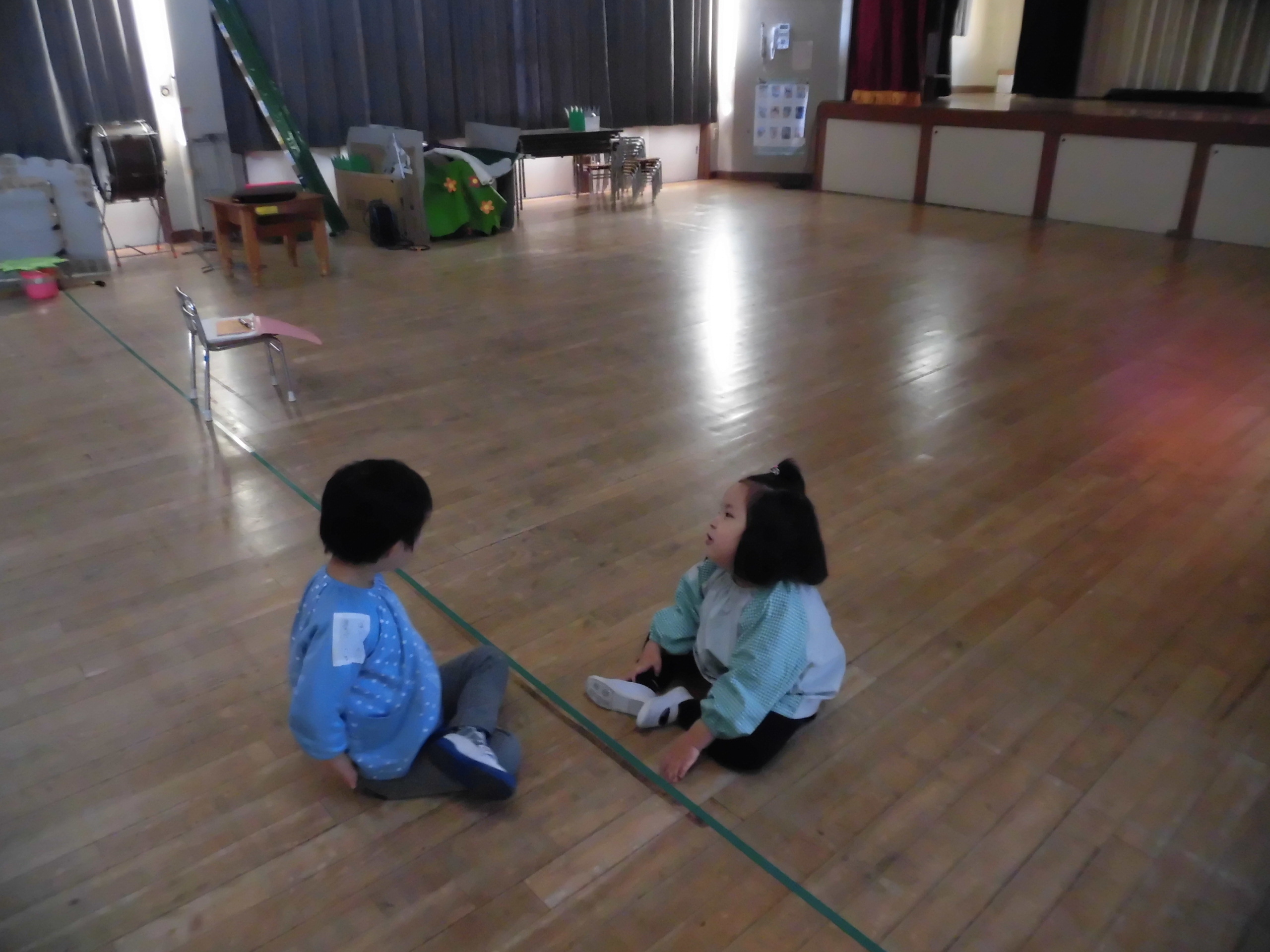 練習のとき、はと組の先生たちが大道具について相談をしていたら、KくんがとことこYちゃんのところにやってきて座り、向かい合ってなにやらお話していました。ほほえましい姿です。