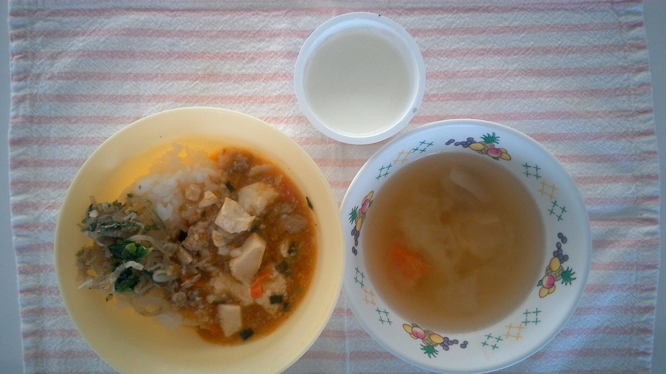 マーボー丼・大根入り五目汁・青菜しらすあえ・ヨーグルト