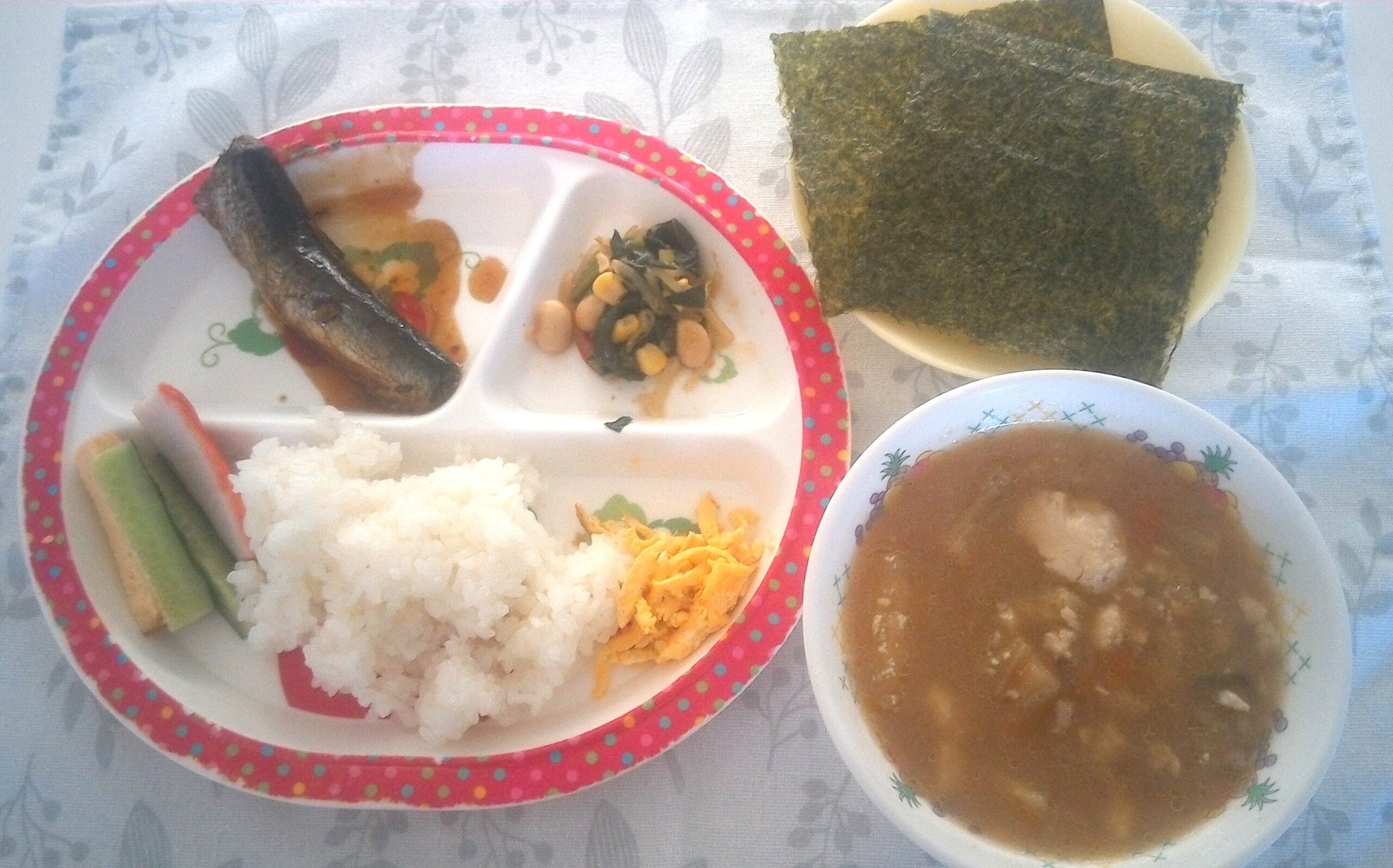 味噌汁には園で採れた大根も加えたほうれん草ともやしの味噌汁。