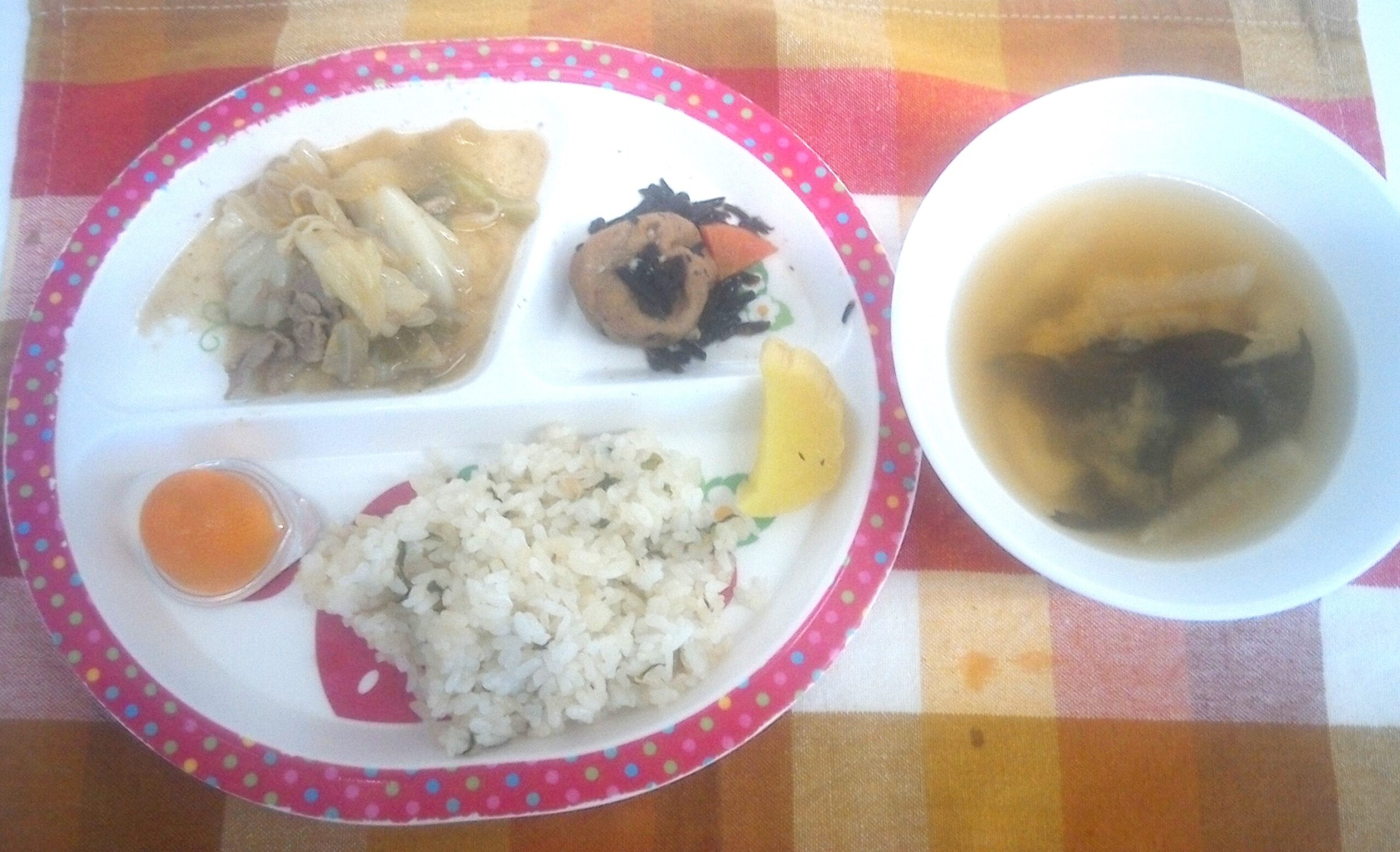 大根の菜っ葉ご飯・かぼちゃ大根の味噌汁・スタミナ焼き・