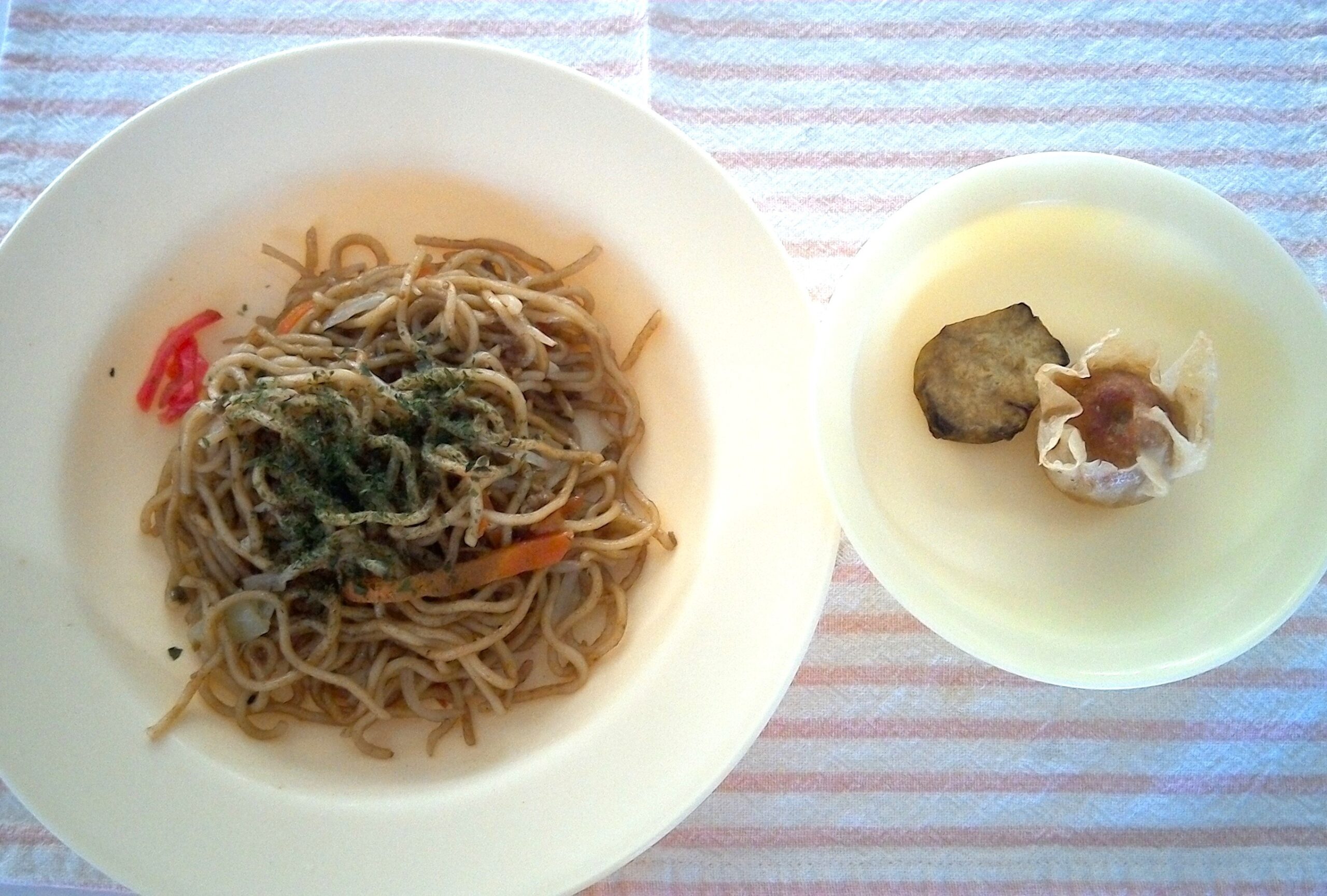 今日の給食はしらすわかめご飯、ミートボールにチャプチェ。
