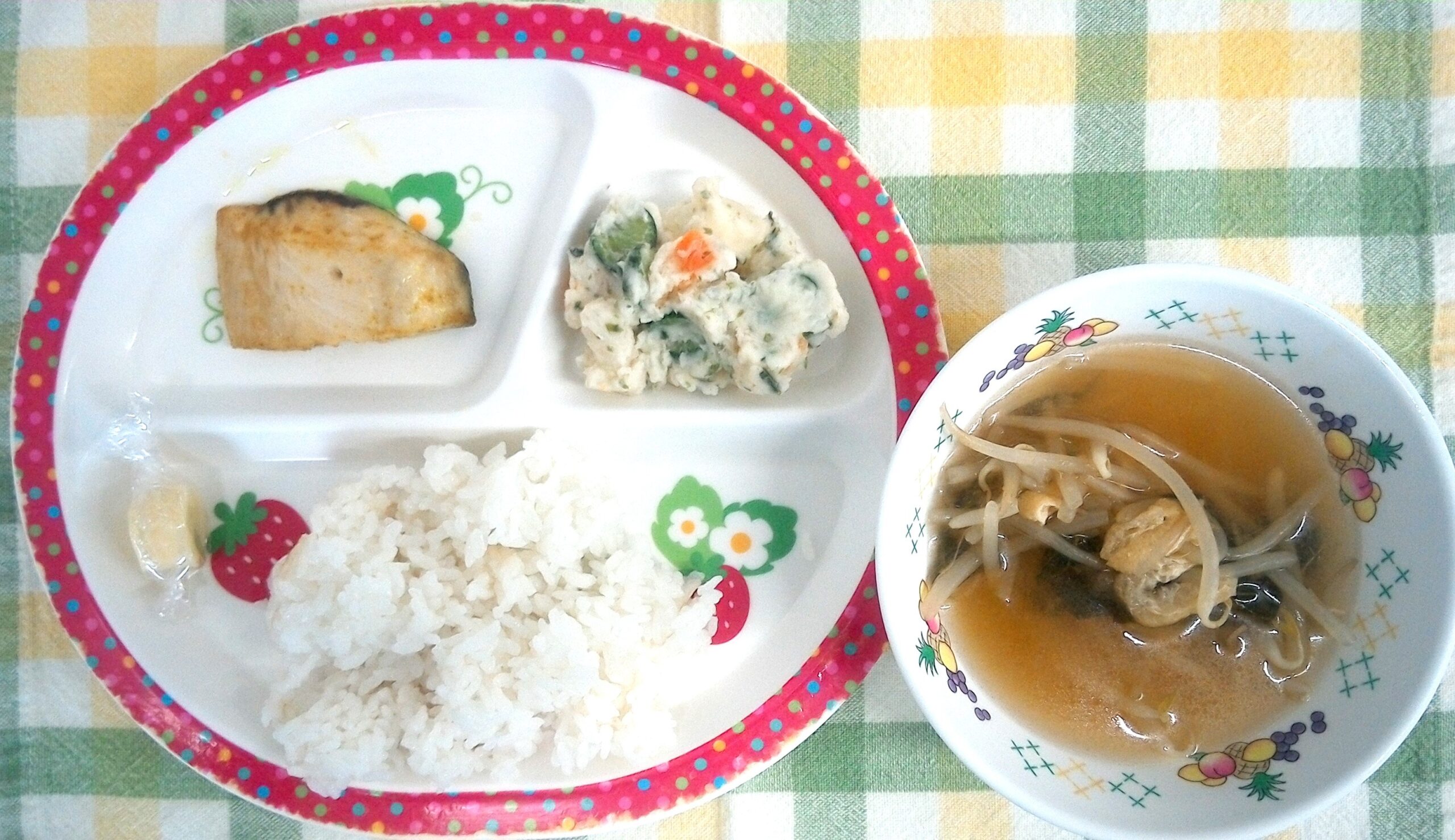 ごはん・小松菜もやしの味噌汁・さばのカレー焼き・和風ポテトサラダ・