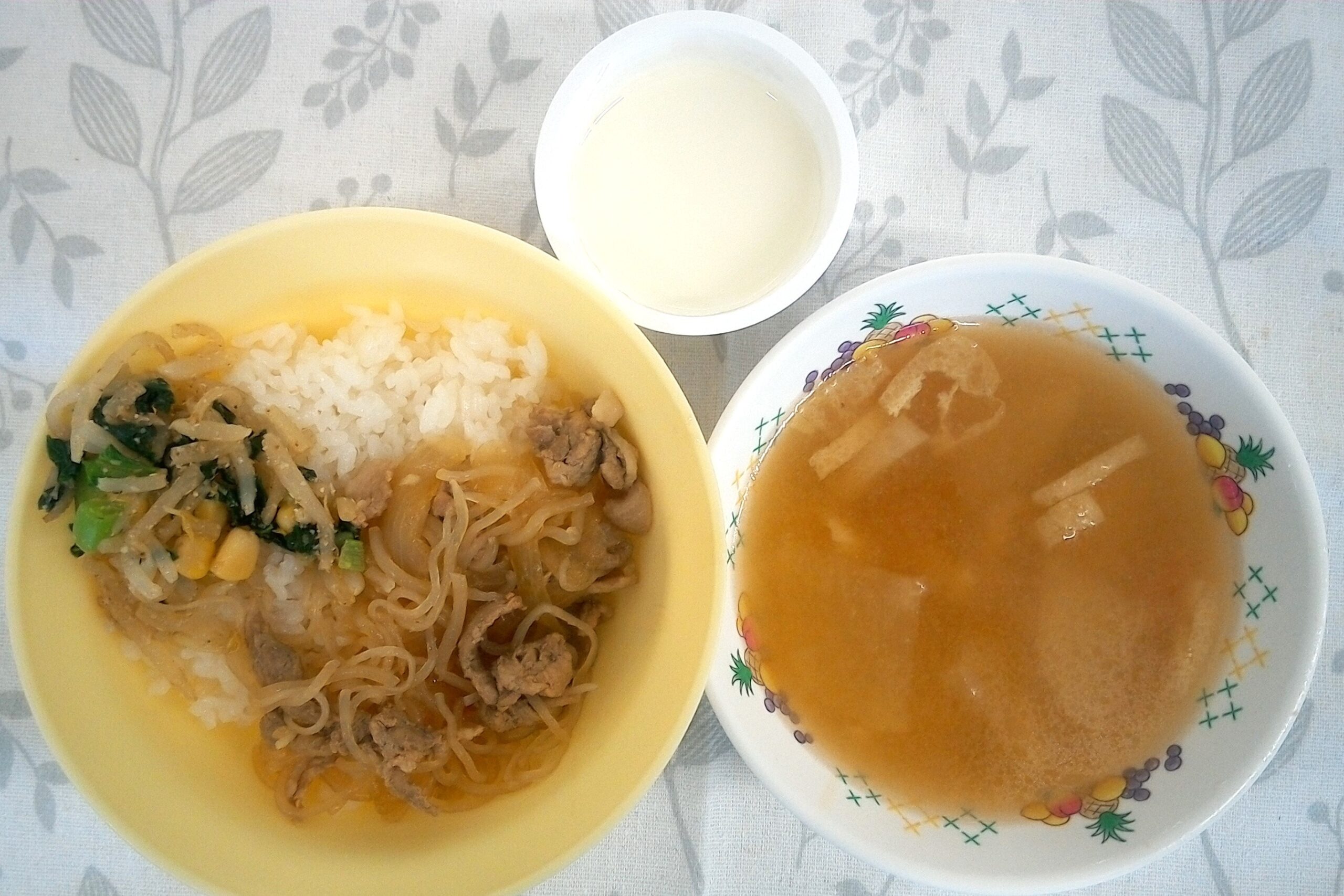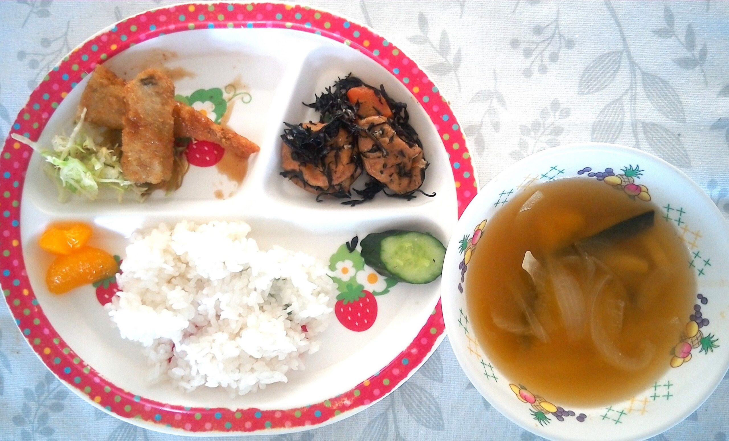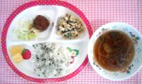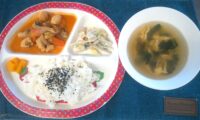 今日の給食は、しらすわかめご飯に春雨スープ。