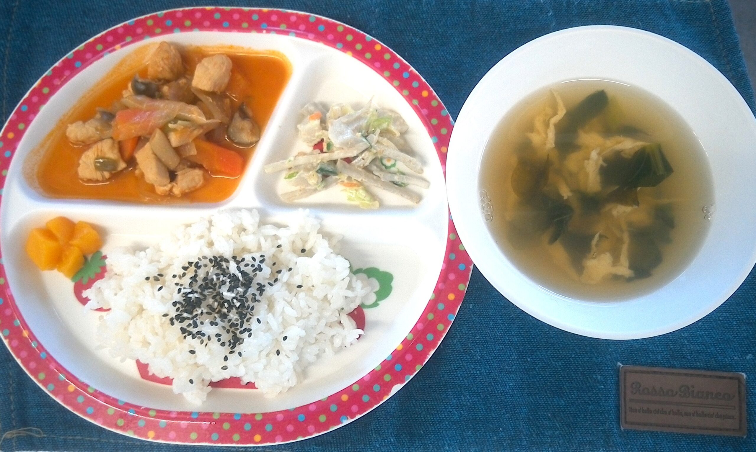 ごま塩ごはん・たまごスープ・鶏肉のケチャップ煮・かみかみサラダ・黄桃缶