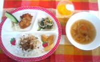 ふりかけご飯・ABCマカロニスープ・唐揚げ・